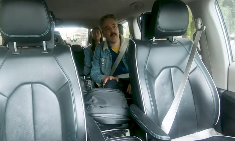 The woman appears unwell in the back seat of an electric car. Photo: Julia Rose |