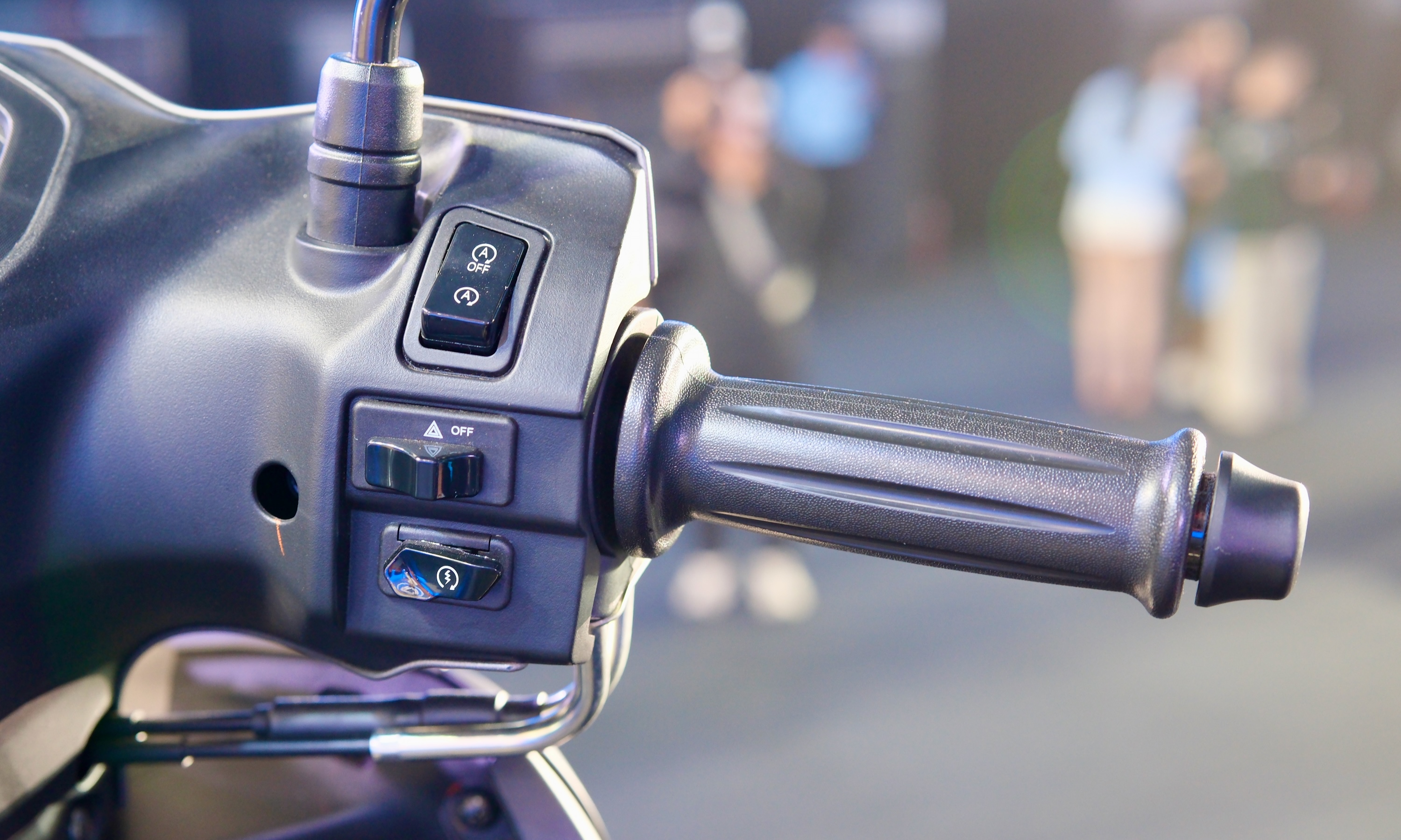 The left handlebar has buttons for the headlight, turn signals, and horn.
