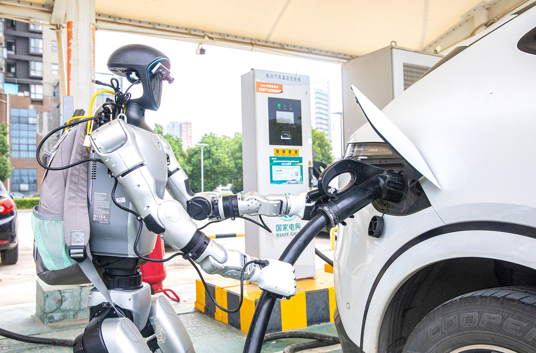 A robot assisting with electric vehicle charging at a station in Huangshi, Hubei province, in September 2025. *Photo: China Daily* |