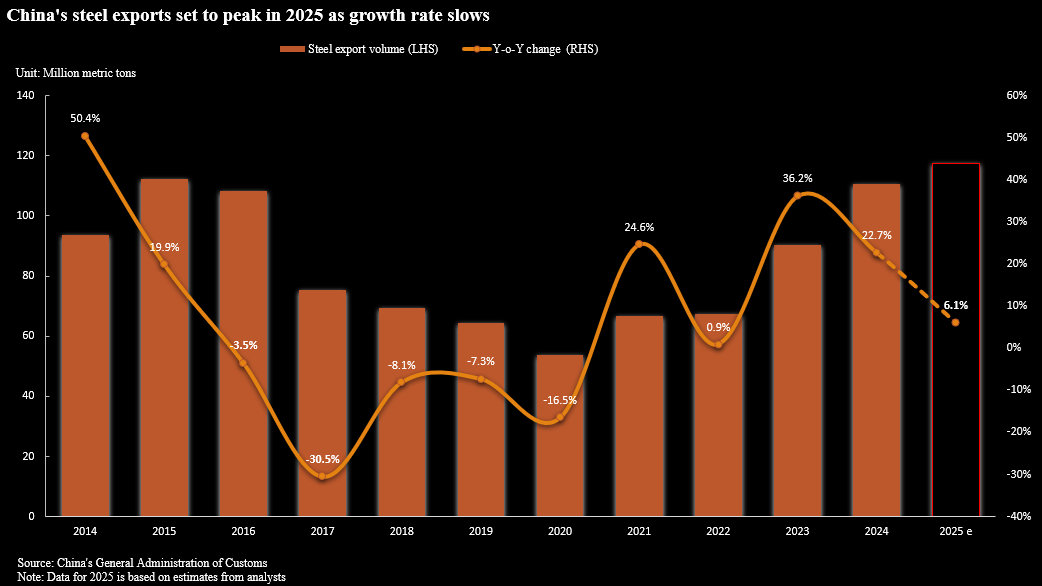China's steel exports over the years and 2025 forecast. Unit: million tons. Source: *Reuters* |