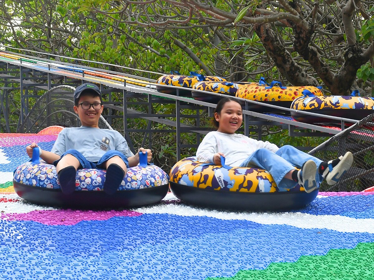 Two visitors are enjoying the Colorful Slide, a new attraction launched this year at Dam Sen. Photo: DSP |