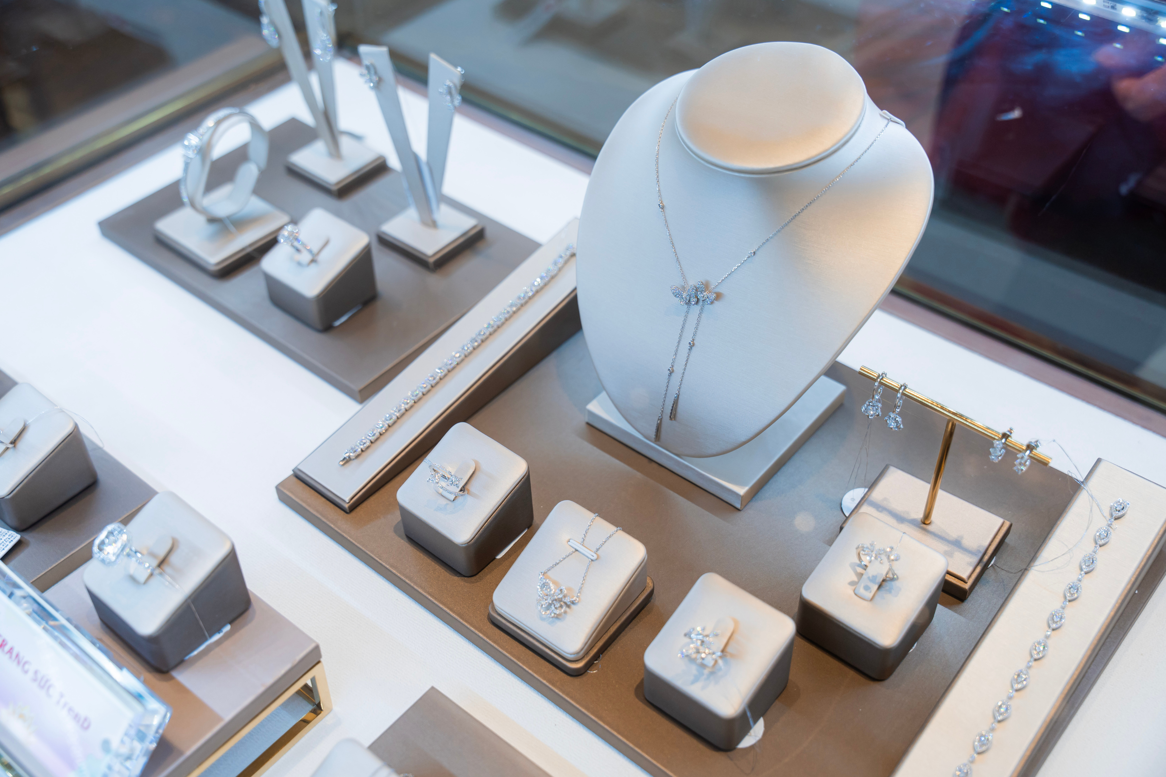 The interactive zone is divided into various specialized stalls for each product type, including: diamond jewelry, TrenD jewelry, wedding jewelry, loose diamonds, 24K gold jewelry, and gemstones. Customers can admire and try on pieces to appreciate the beauty of each design and select a suitable style.