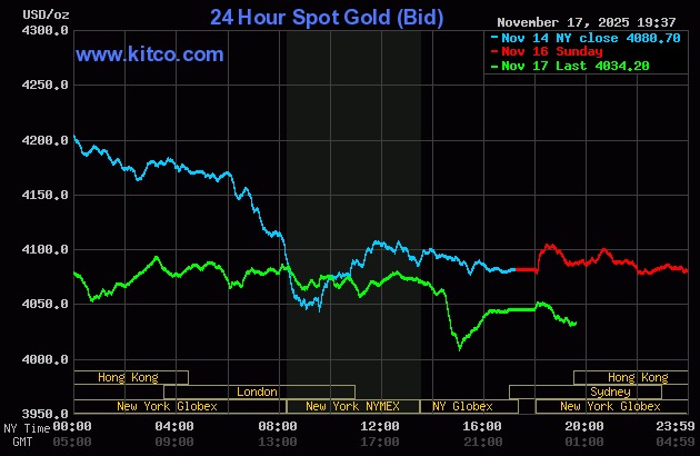 On 17/11, global spot gold prices closed down 36 USD, settling at 4.044 USD an ounce. This marked the third consecutive session of decline for the precious metal. As trading opened on 18/11, the market continued its downward trend, currently trading at 4.034 USD.