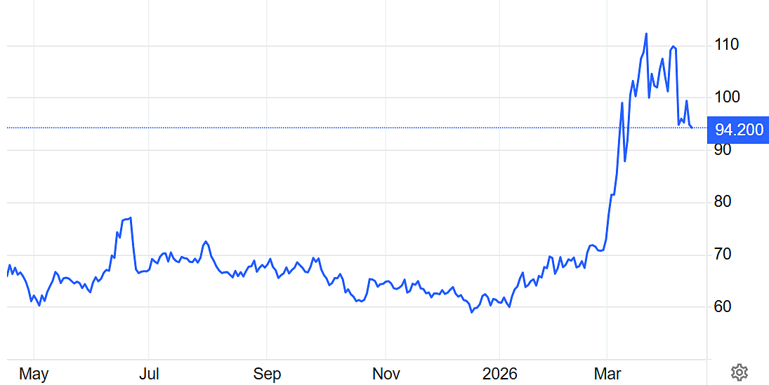 On 14/4, Brent crude oil prices closed down 4,6% to 94,8 USD per barrel. US WTI crude fell 7,8% to 91,2 USD. Both oil types continued to see slight declines on 15/4.