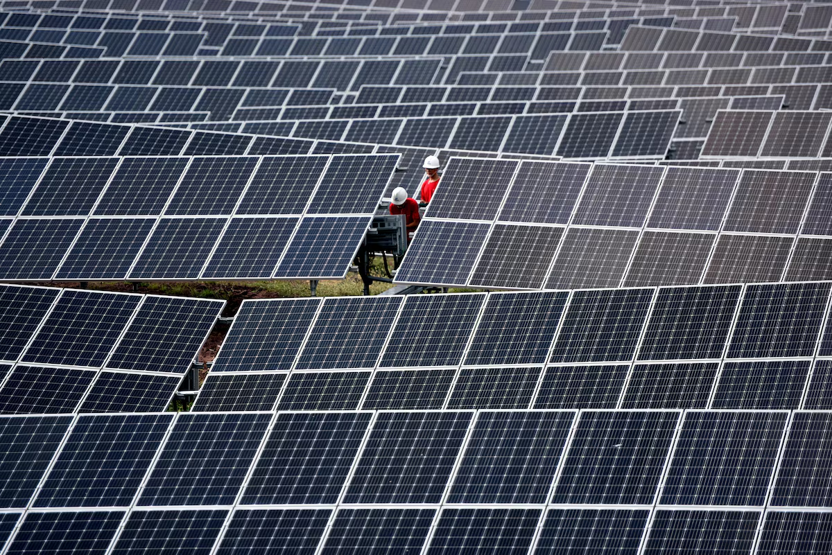 Workers inspect solar panels at a solar power farm in Linyi, Shandong province, China, 11/8/2018. *Photo: Reuters*