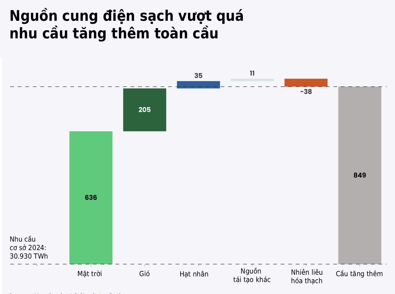 The report indicates that solar power increased by 30%, adding 636 TWh, which is double the United Kingdom's annual electricity demand. More than half of this output originated from Trung Quoc. Alongside wind and nuclear power, renewable energy reached 887 TWh, exceeding the total increase in electricity demand (849 TWh). Notably, solar power alone met three-quarters of this demand.