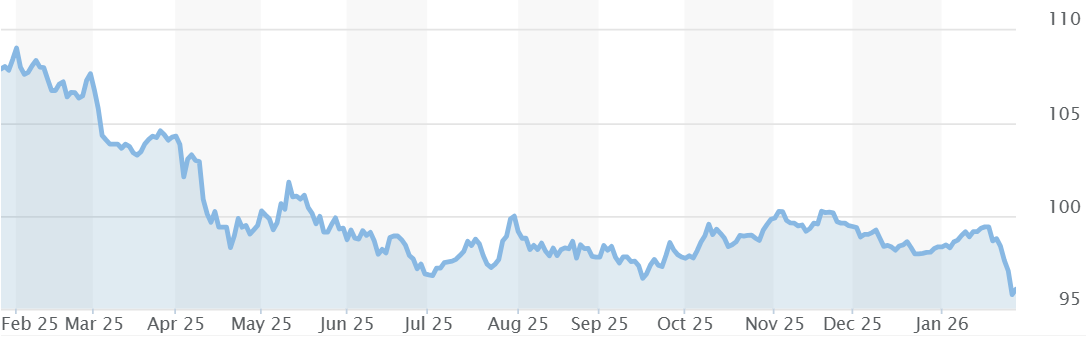 On the morning of 28/1, the Dollar Index, which measures the US dollar's strength against a basket of six major currencies, fell to 95.56 points. This marks its lowest level since 2/2022.