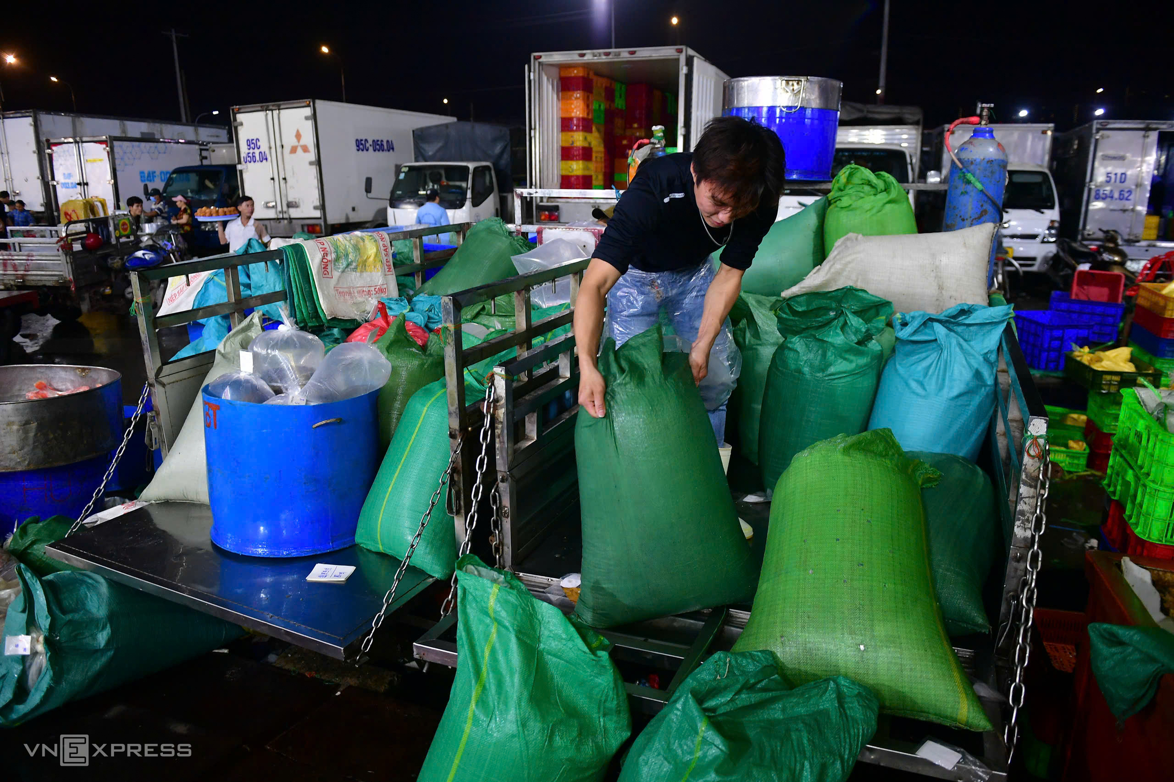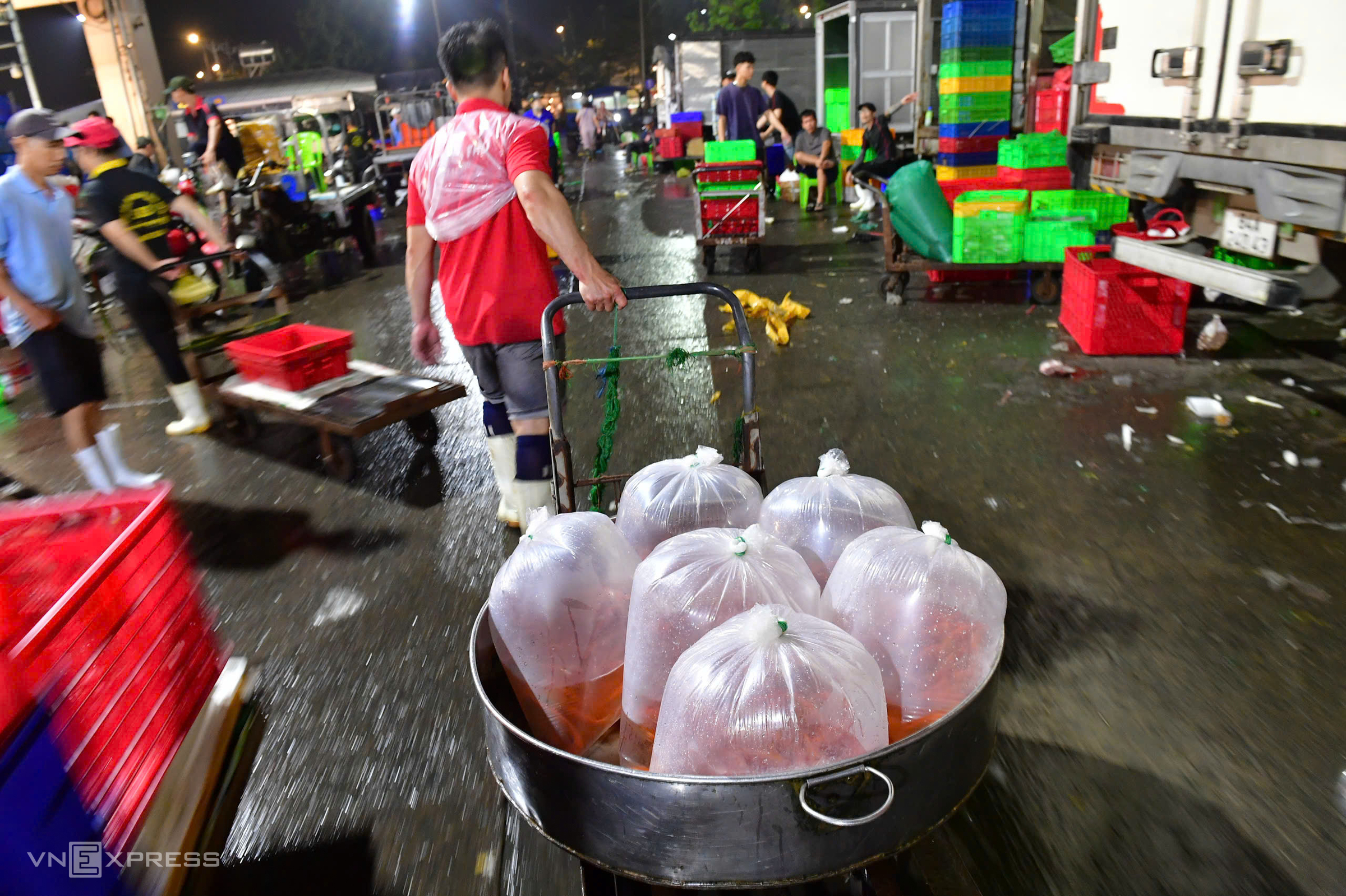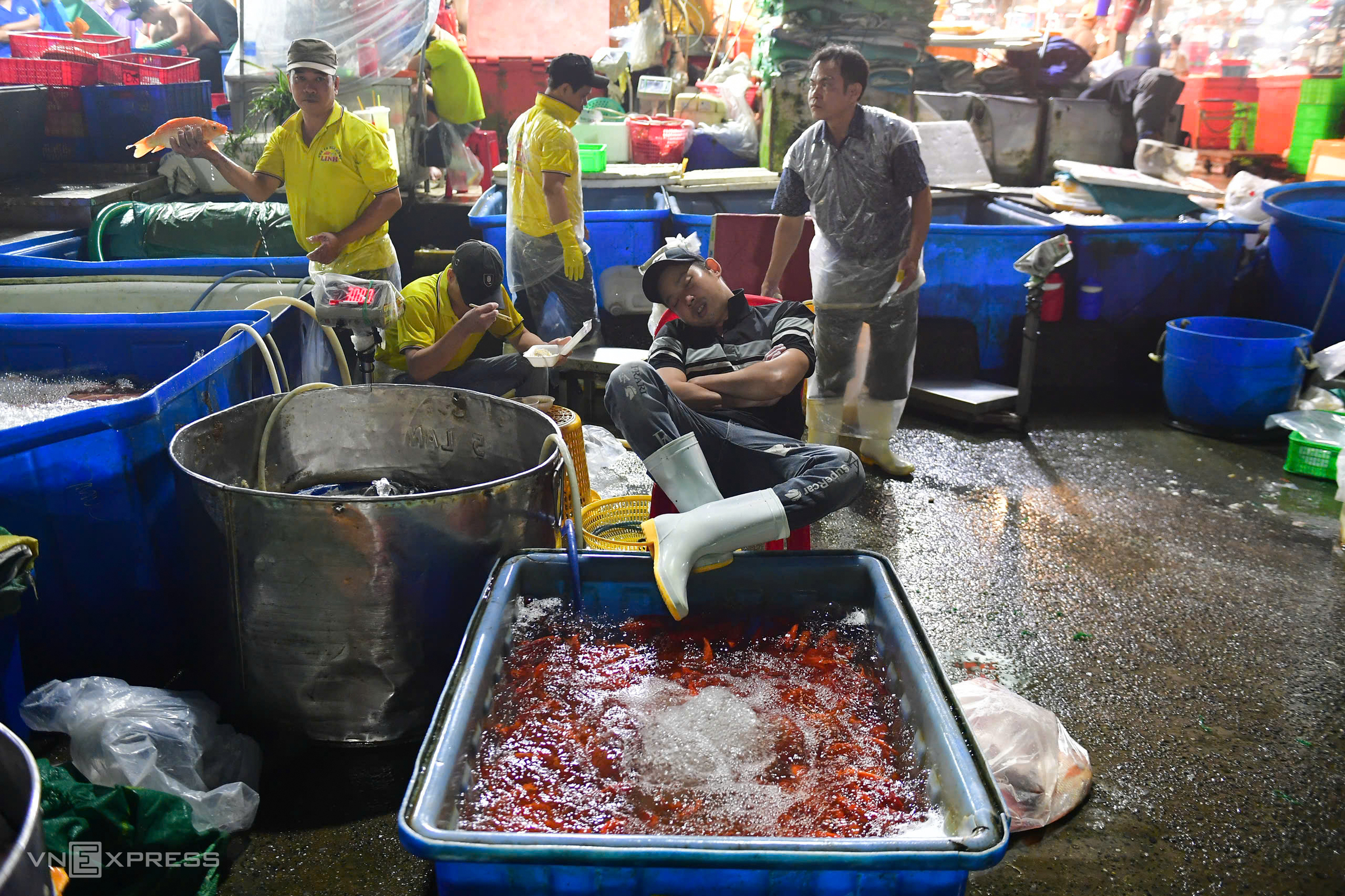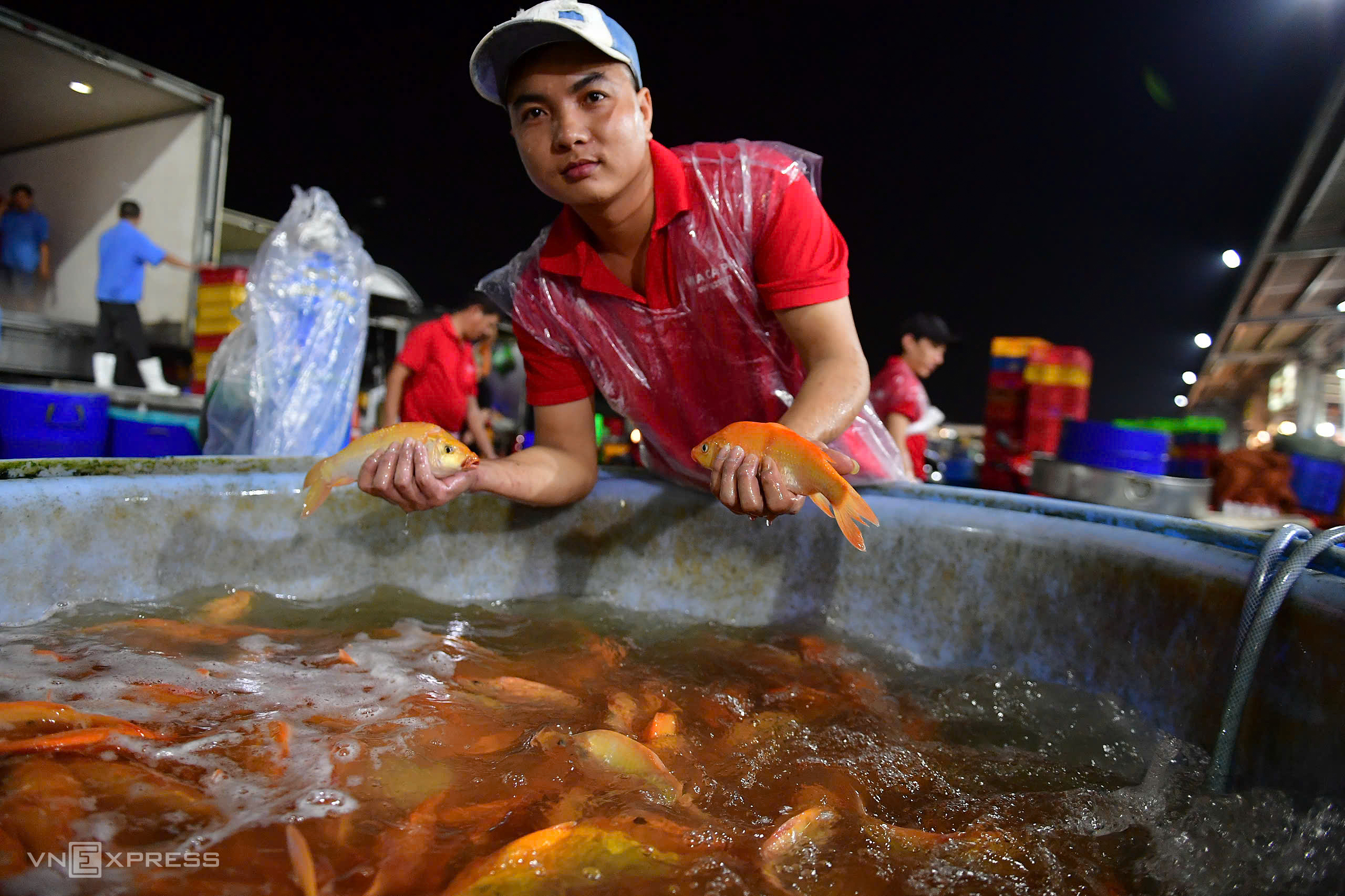 At midnight, dozens of carp stalls at Binh Dien wholesale market in Binh Dong ward were busy with buying and selling for ong Cong ong Tao day.