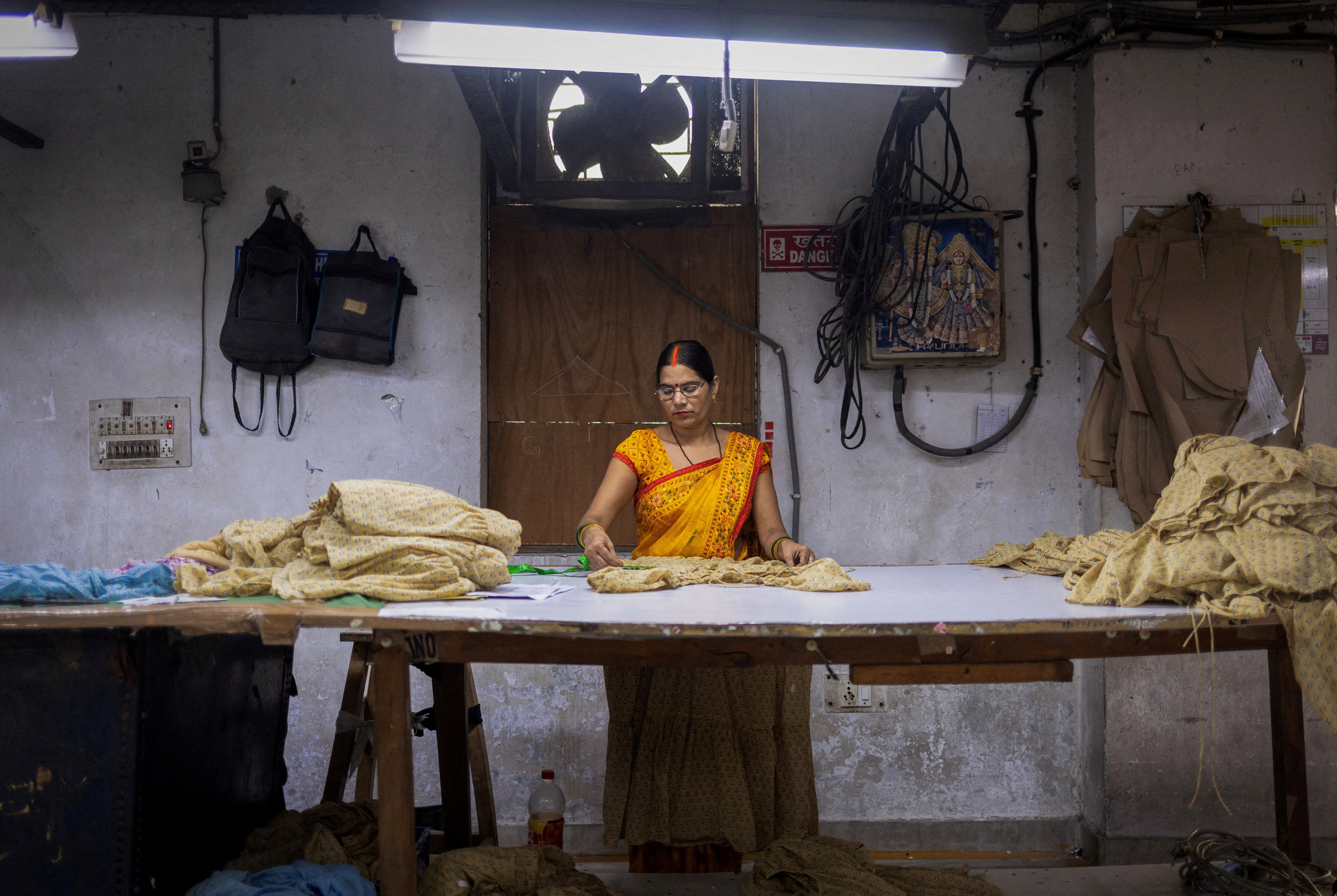 Workers measure fabric to prepare for dressmaking at a garment factory in Noida, India, on 7/8. Photo: Reuters