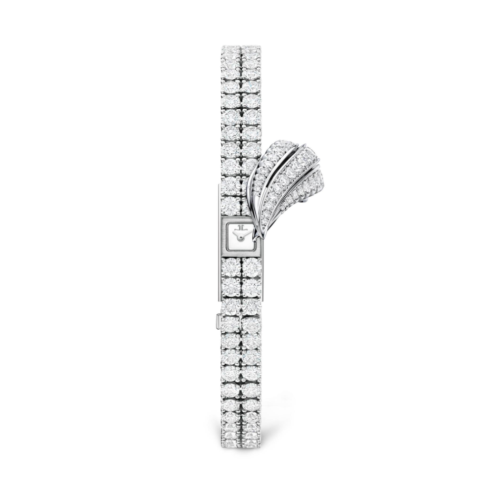 The 101 Feuille high-end jewelry watch in white gold draws inspiration from a sparkling diamond bracelet. Internally, the 101 Feuille houses the micro-movement Calibre 101. According to the brand, this is the world's smallest mechanical watch movement, weighing approximately one gram, with a thickness of 3,4 mm and a volume of 0,2 cm3, despite being composed of nearly 100 components.