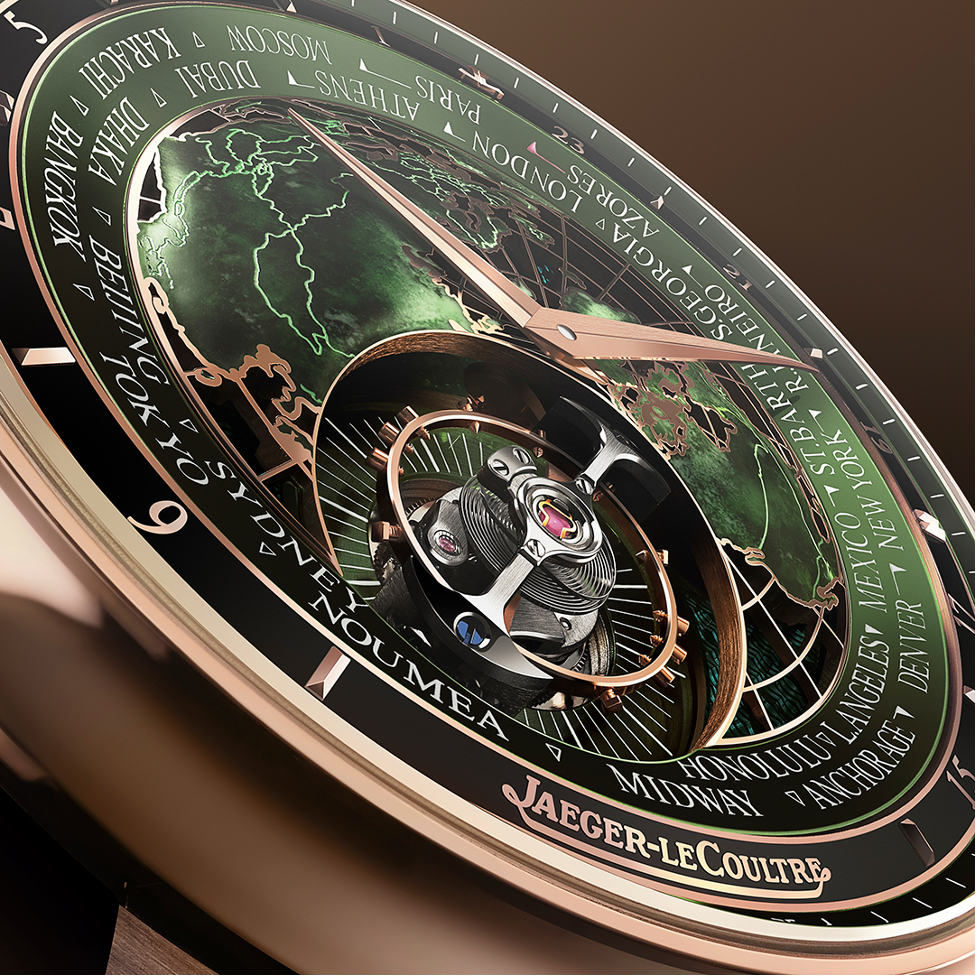 Few world time watches (tracking time in multiple locations globally) incorporate a tourbillon regulator. According to the brand, the Master Grande Tradition Calibre 948 is the first timepiece to achieve this. The dial's map rotates once every 24 hours, synchronized with the tourbillon cage. |