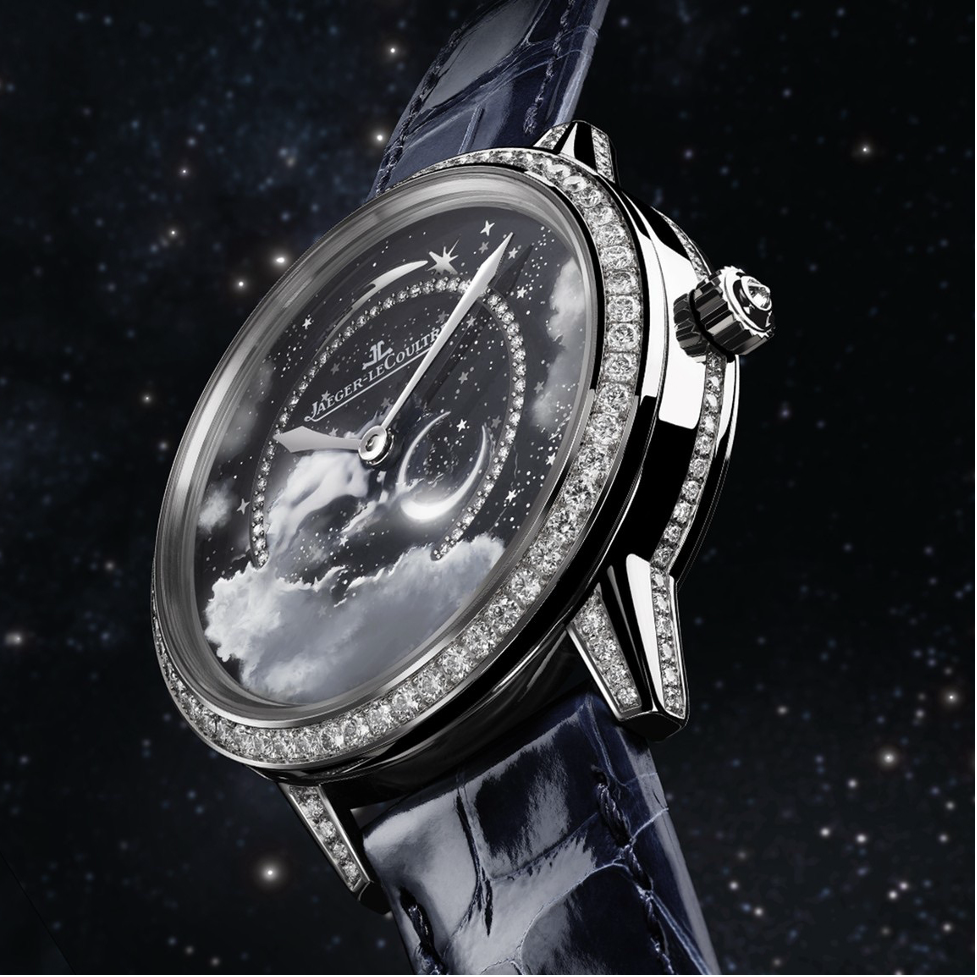 Shooting stars inspire Jaeger-LeCoultre's feminine Rendez-Vous watch line. This model also originated from the Metiers Rare division, featuring a multi-layered sapphire crystal dial, with clouds and moonlight alternately obscuring and revealing sparkling stars. |