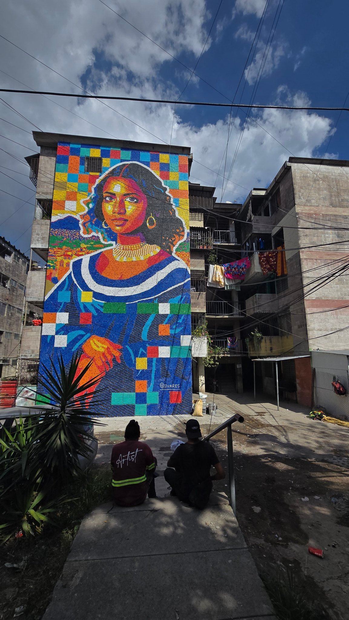 The creation of the 13-meter mural involved an extensive community effort. Over 100,000 plastic caps were meticulously collected and cleaned by residents of the Zacamil neighborhood alongside waste pickers from the National Association of Collectors and Recyclers of El Salvador (ASONARES). The artist, born in 1996, deliberately used the original colors of the caps, making the selection and sorting of materials an integral part of his creative process. This collection and sorting phase took several months, while the final assembly of the mural required three weeks.