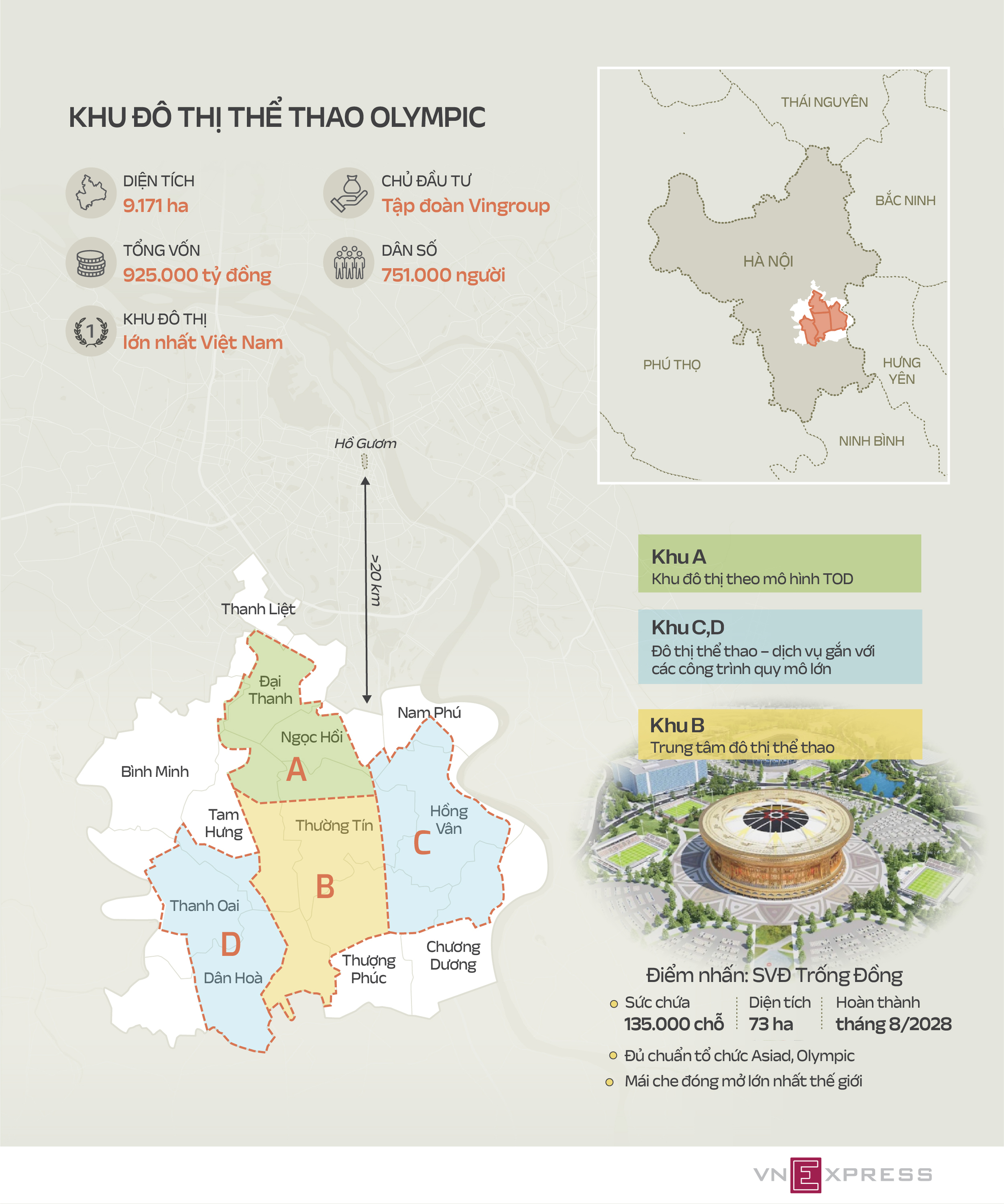 According to the environmental impact assessment (EIA) report currently open for public comment, the Olympic Sports Urban Area project by Vingroup is a national key initiative. It aligns with the vision of establishing an Olympic urban center and a regional and international sports hub.