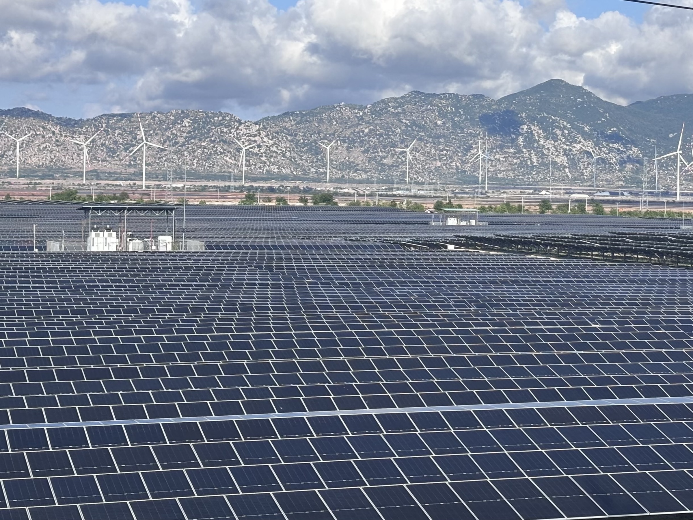 Solar panels and wind turbines at a plant in Khanh Hoa. Photo: Thai Anh