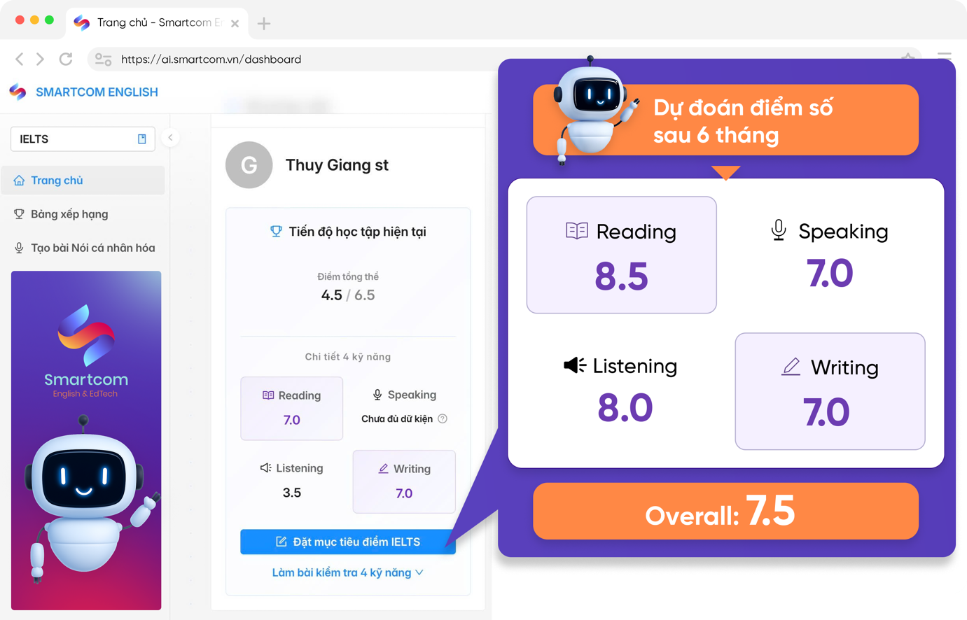 In addition to analyzing learning data, Smartcom AI also supports personalized speaking practice with a chatbot, provides a real-time learning report system, and offers parent accounts to monitor academic progress. Alongside artificial intelligence-powered learning, students can participate in online IELTS practice sessions with Smartcom instructors to refine all four skills.