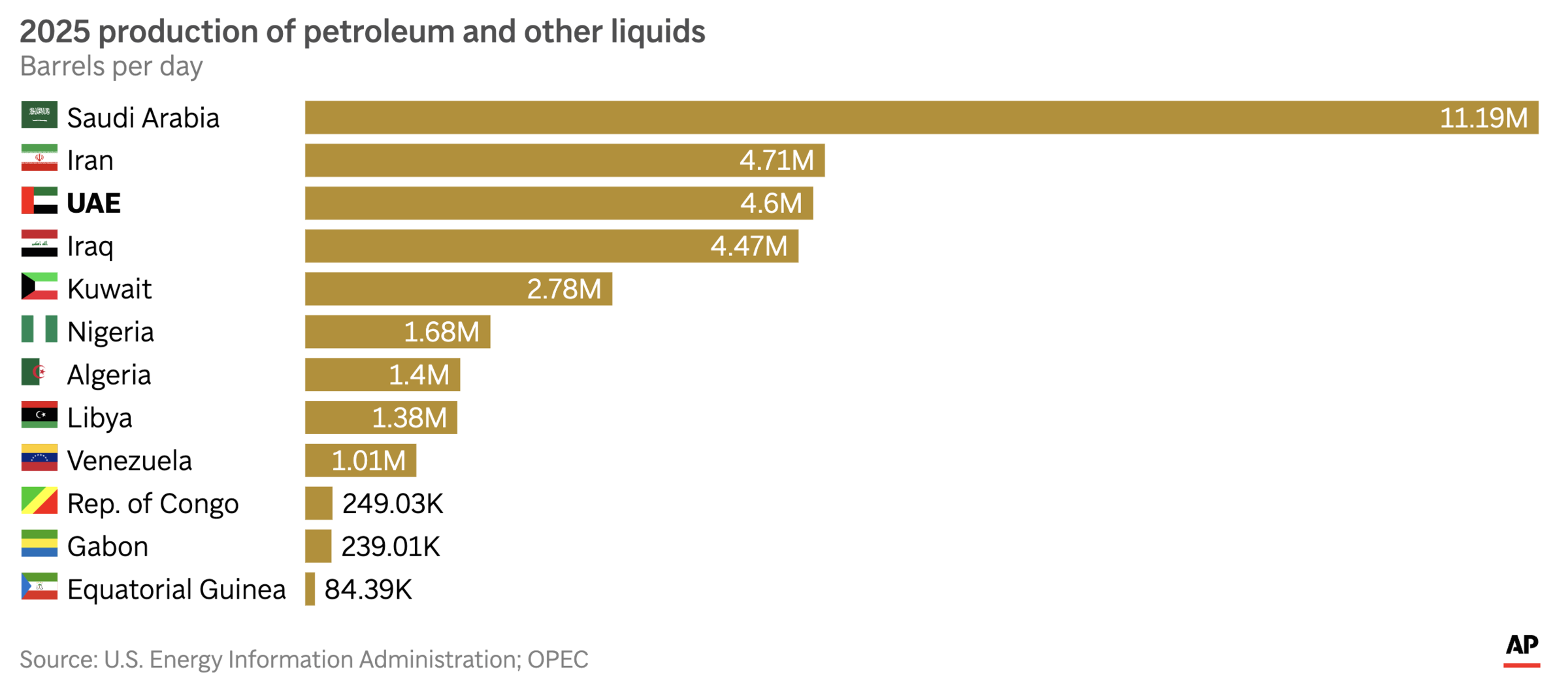 Oil and related product output of OPEC members (million barrels/day). *AP* |