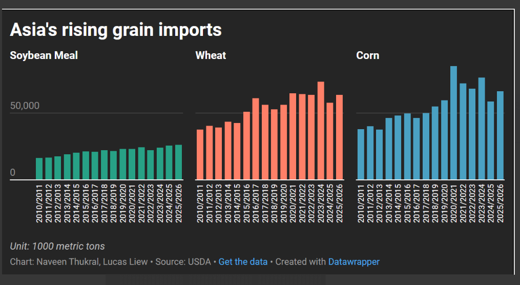 Asia is a net food importer, with rising populations and incomes driving increasing demand. The region accounts for approximately 30% of the world's wheat, corn, and soybean meal imports, according to the US Department of Agriculture.
