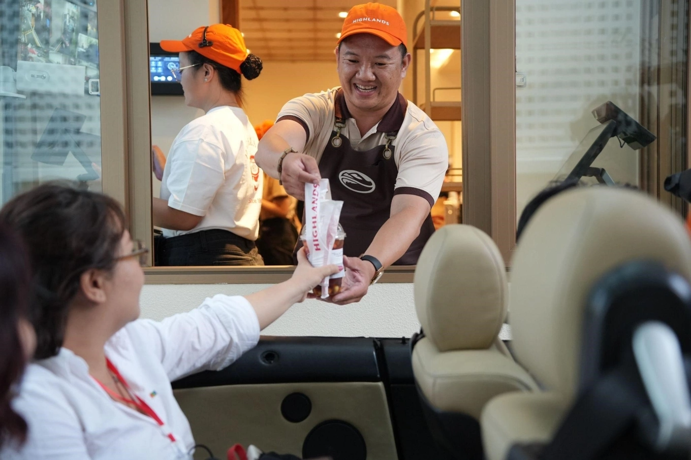 The new "drive-thru" model (buying coffee without leaving your car) has been launched in Ho Chi Minh City. Photo: Highlands |