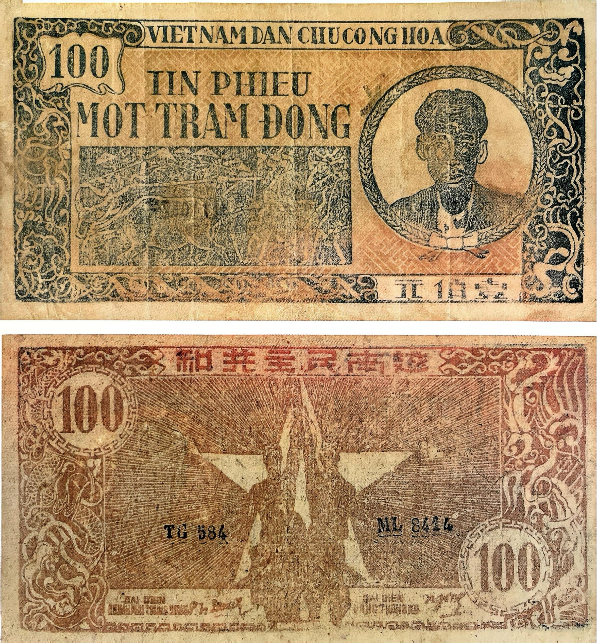 The French also attempted to undermine the Vietnamese currency through propaganda and by counterfeiting it. To counter this, 100-dong notes were issued with an official seal, known as "tien dap nen" (foundation money).