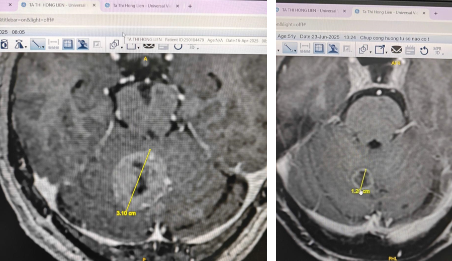 Following the treatment, the brain tumor shrunk from 3.1 cm to 1.2 cm, and the lung tumor decreased to 17 mm x 23 mm.
