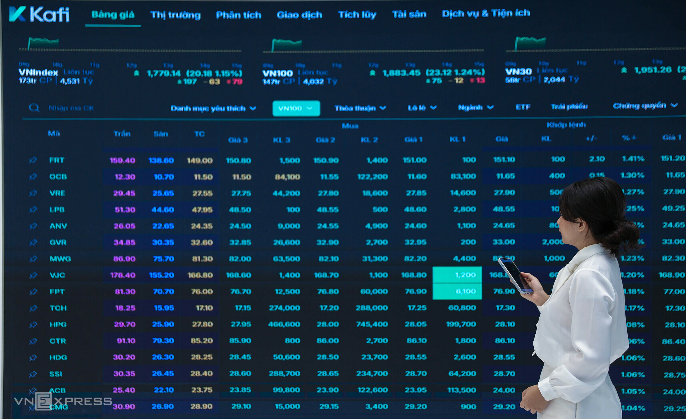 Investors monitor the electronic trading board at Kafi Securities Company, 4/2026. Photo: Quynh Tran |