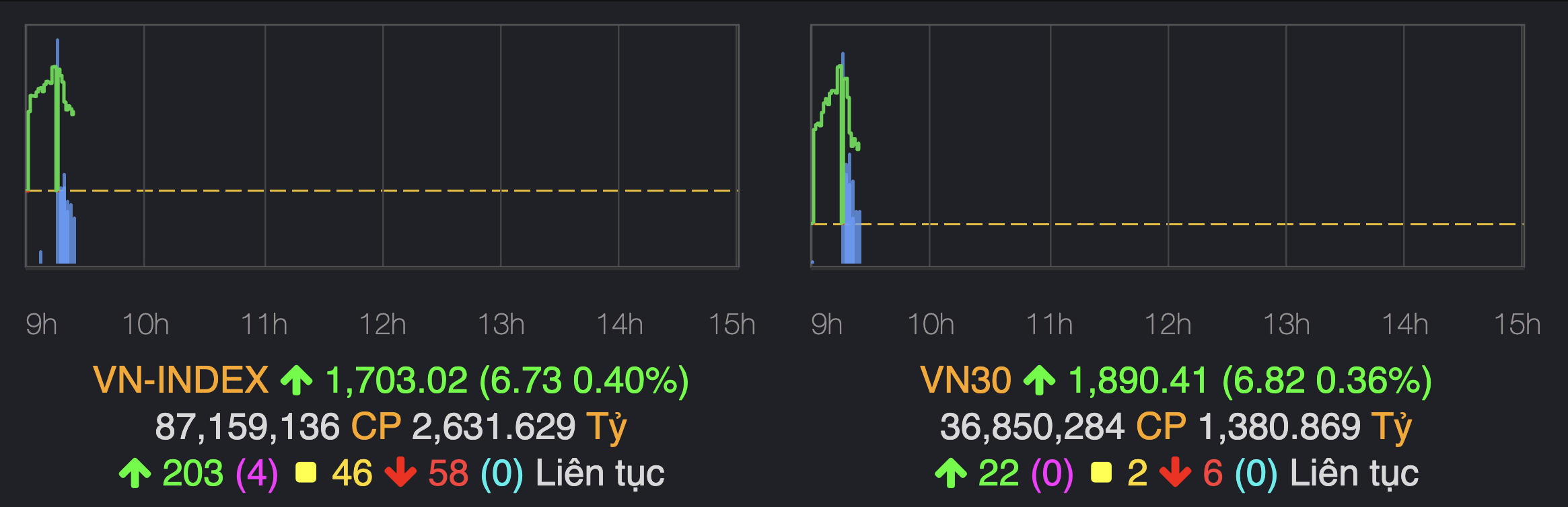 Immediately following the opening auction (ATO), the benchmark index for the Ho Chi Minh City Stock Exchange jumped to nearly 1,707 points. The market was awash in green, with over 200 stocks gaining value, twice the number of declining stocks. The large-cap index, VN30, also saw 20 stocks rise and approached the 1,900-point mark.