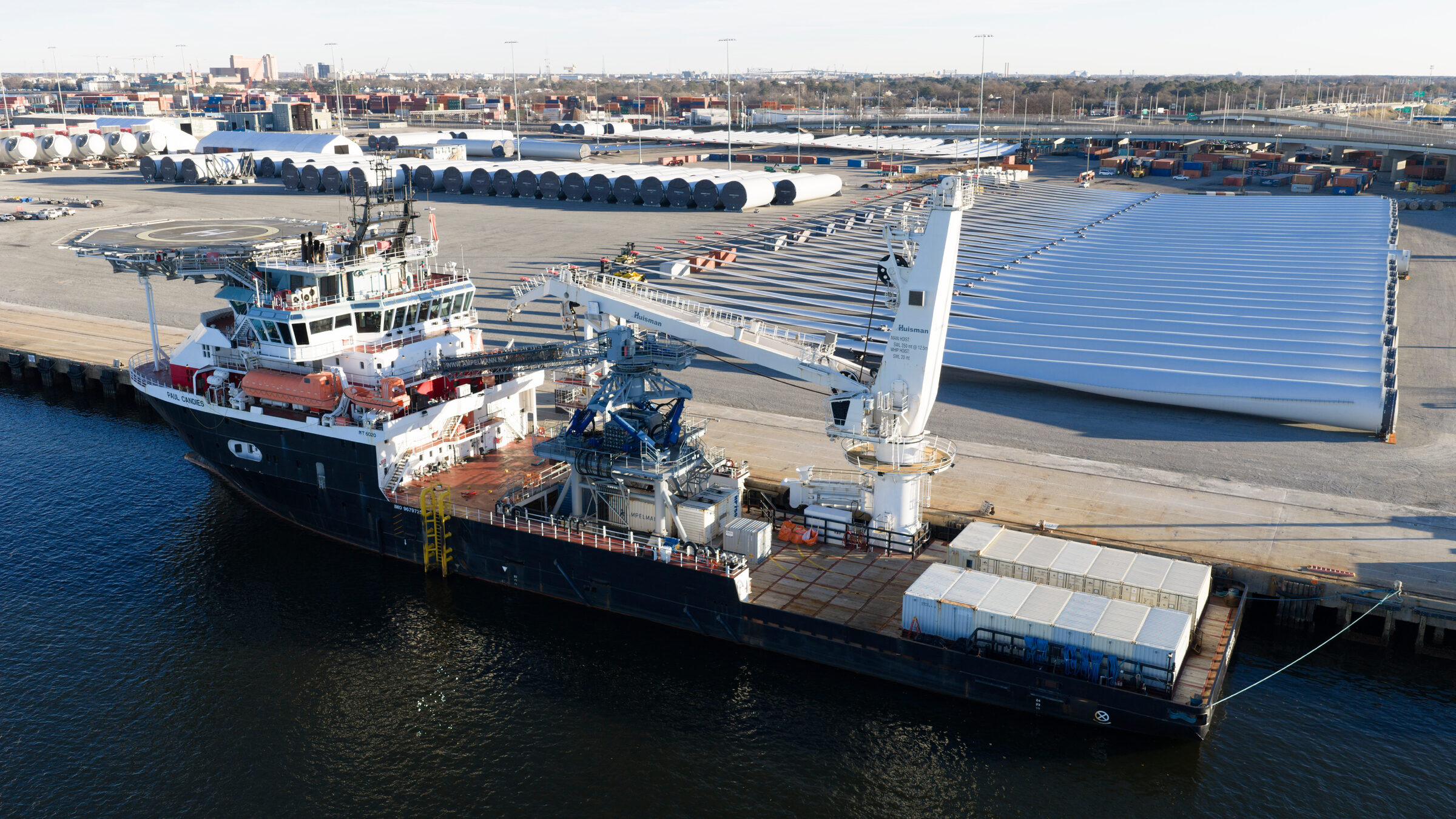 Wind turbine components and support vessels of Dominion Energy at Portsmouth Marine Terminal, 22/12, in Portsmouth, Virginia, US. *Photo: AP* |