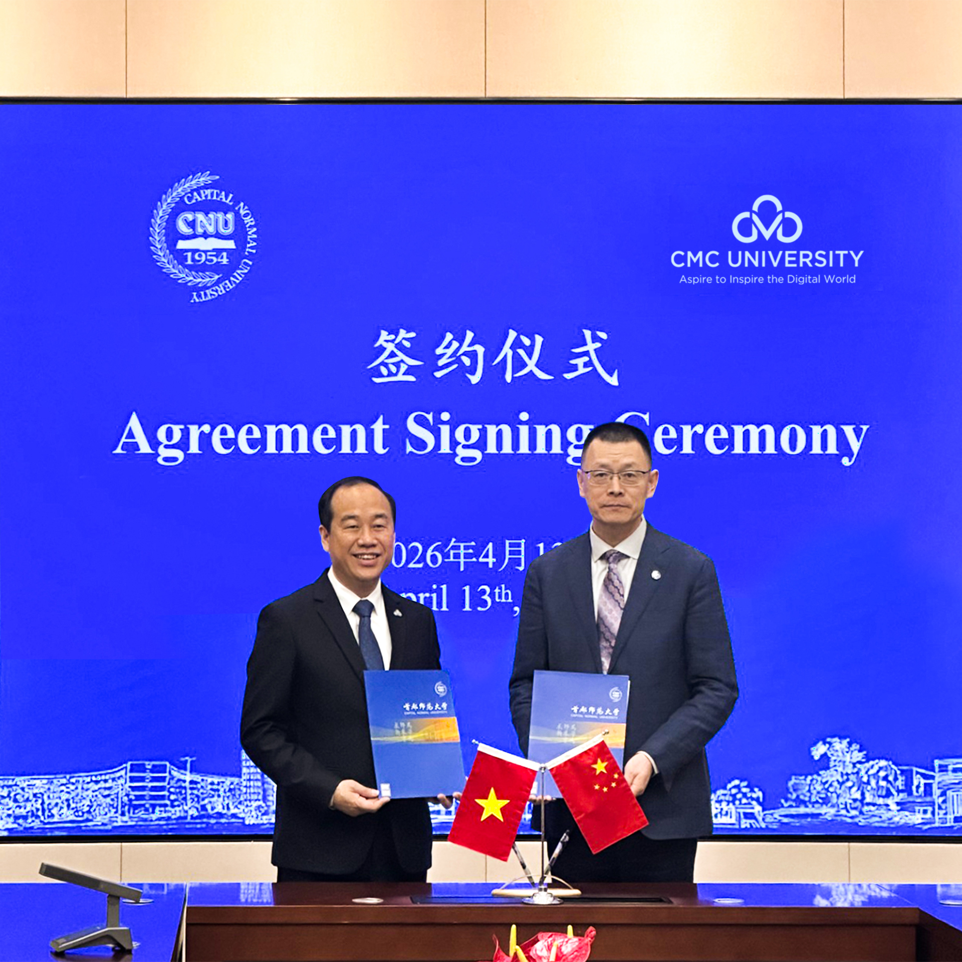 Representatives from CMC University and Capital Normal University (CNU) signed the cooperation agreement on 13/4. Photo: CMC University |