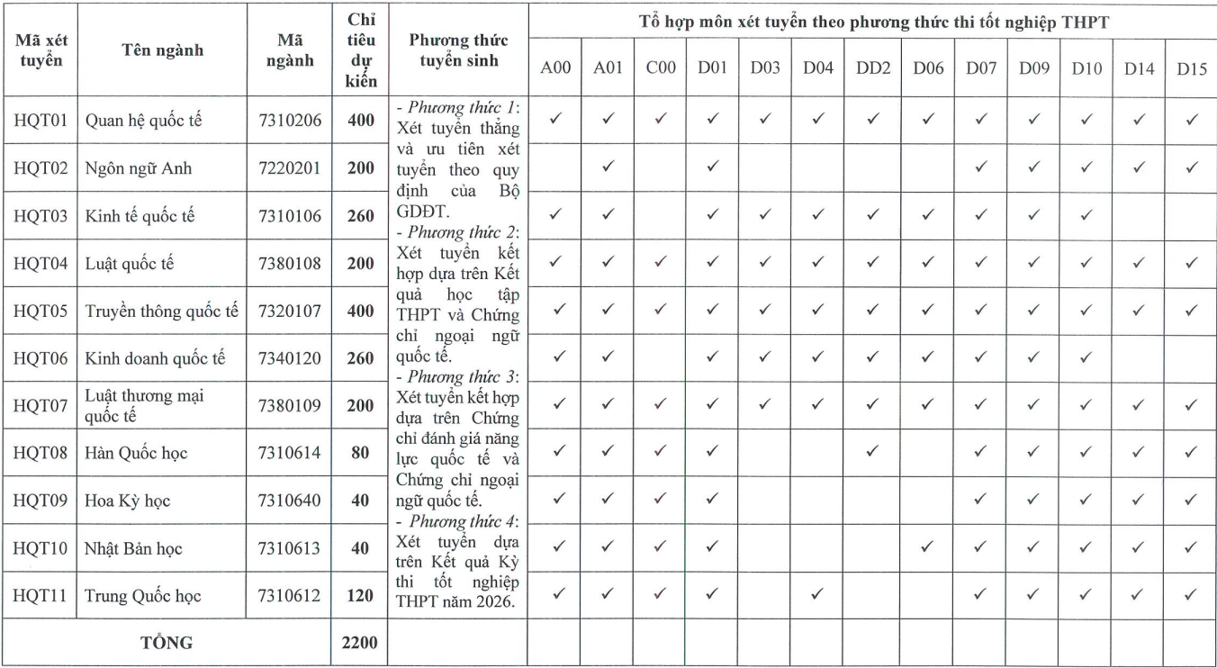 The total quota for 14 majors is 2.200, consistent with last year. The number of subject combinations also remains stable at 13, including A00 (Math, Physics, Chemistry), A01 (Math, Physics, English), C00 (Literature, History, Geography), D01, 03, 04, 06, D2 (Math, Literature, English/French/Chinese/Japanese/Korean), D07 (Math, Chemistry, English), D09 (Math, History, English), D10 (Math, Geography, English), D14 (Literature, History, English), and D15 (Literature, Geography, English).