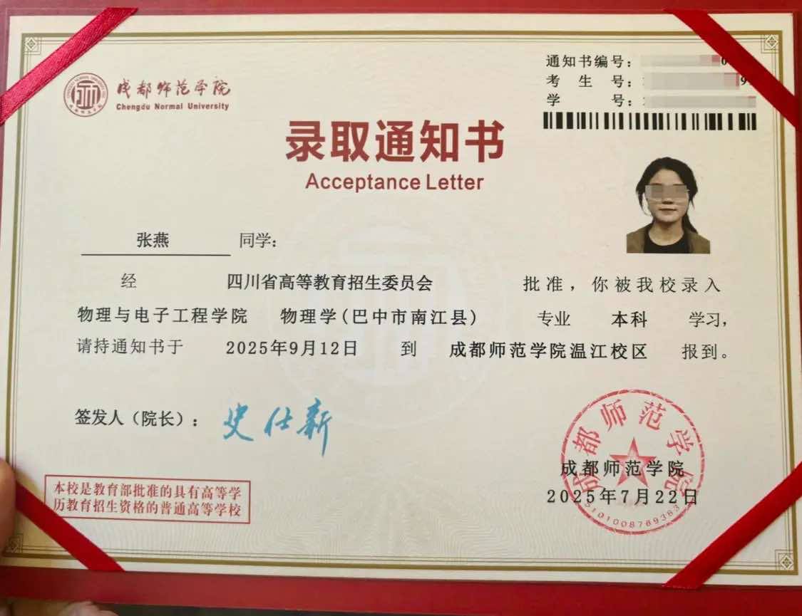 Zhang Yan's acceptance letter from Chengdu Normal University. Photo: Red Star |