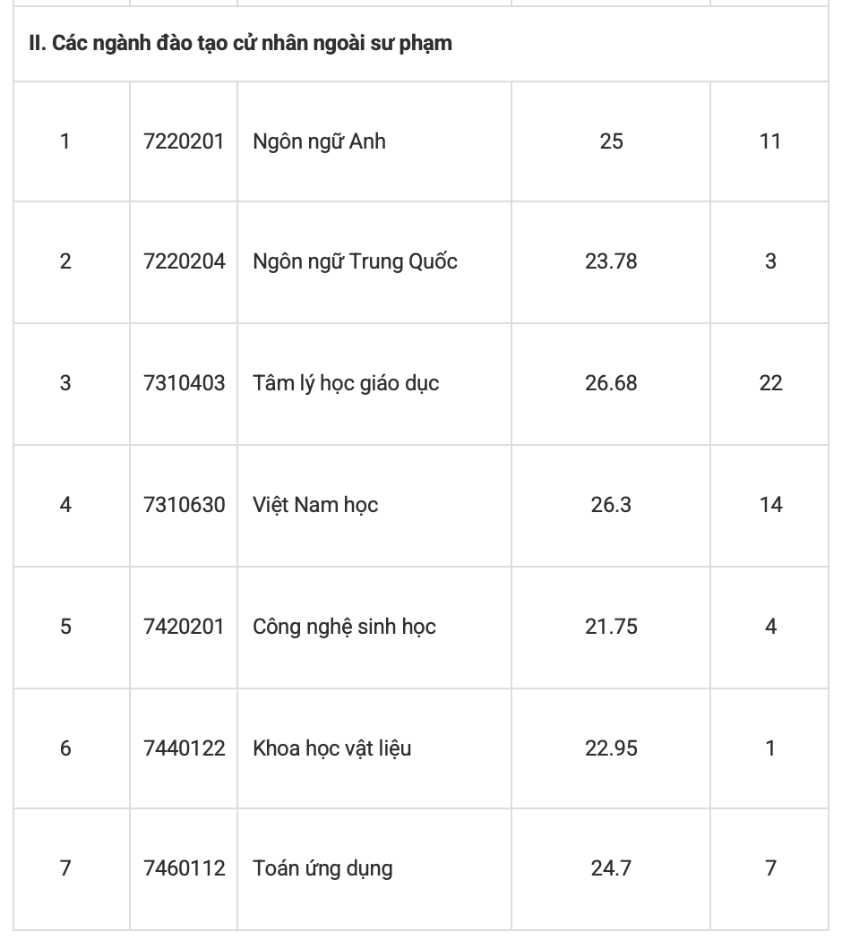 Hanoi National University of Education 2 (HPU2) announced on 22/8 that several traditionally high-scoring programs, such as literature education (28.52), history education (28.31), and history-geography education (28.03), remain at the top. Many other programs have scores in the 24-26 range.