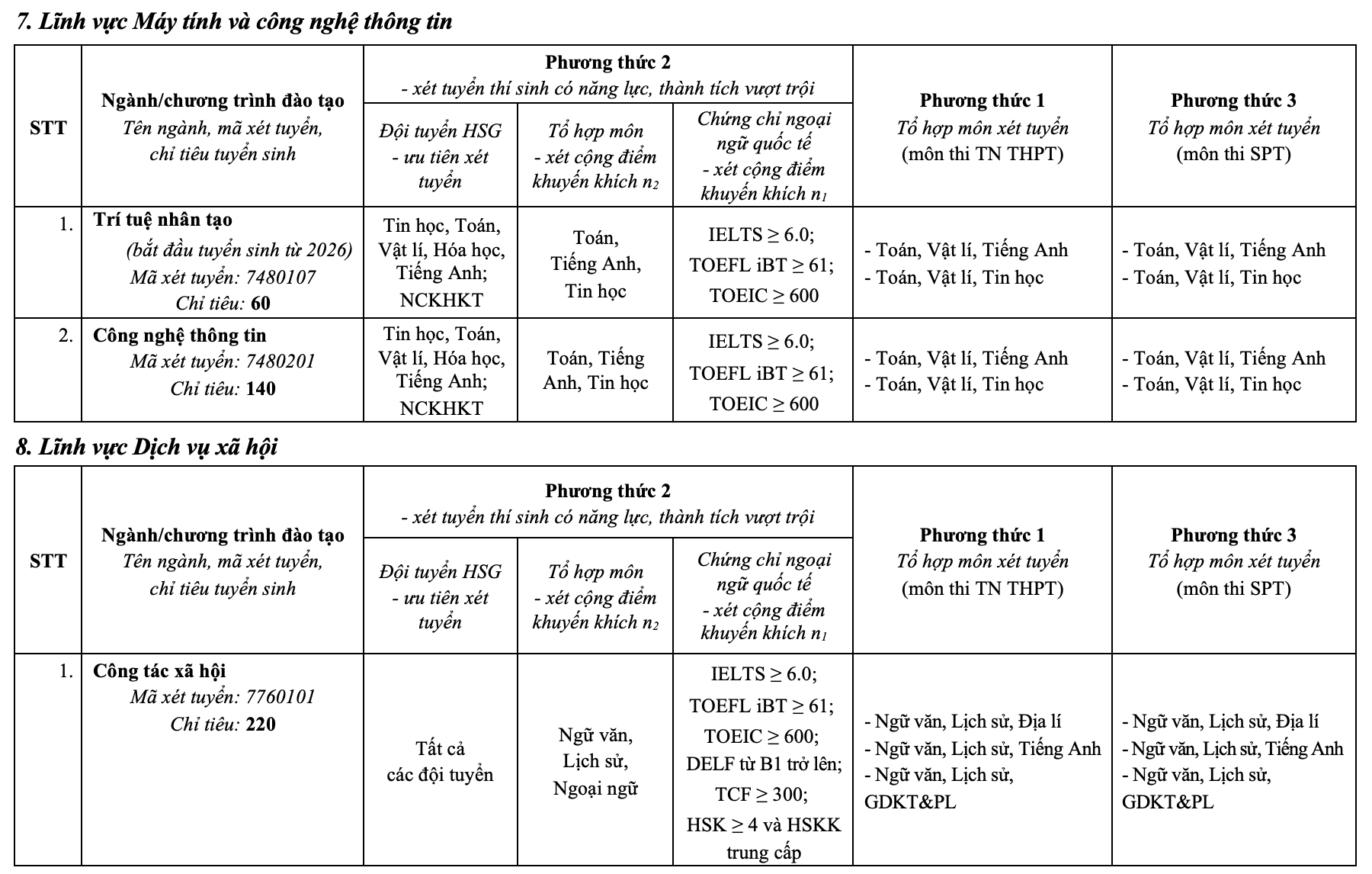 For the SPT competency assessment test admission method, candidates must take at least three subjects in the SPT exam for score-based consideration according to subject combinations. These students must also have achieved a "good" academic performance in 12th grade or a high school graduation exam score of 8 or higher.