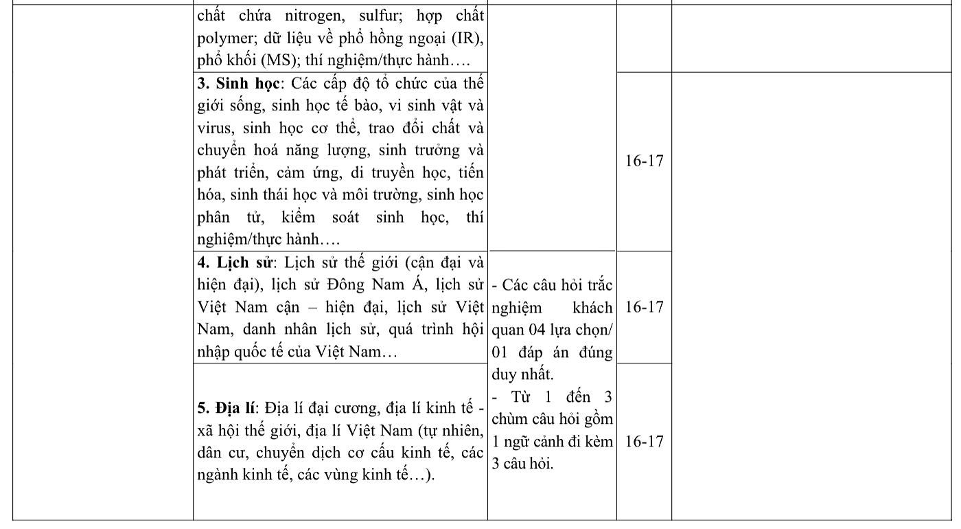 If choosing the science section as the third test, candidates select three out of five subjects: physics, chemistry, biology, history, and geography. Each subject has 16-17 questions.