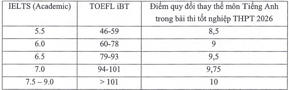 Under the THPT graduation exam score review method, Hoc vien Ngan hang converts IELTS and other foreign language certificates into English subject scores as follows: