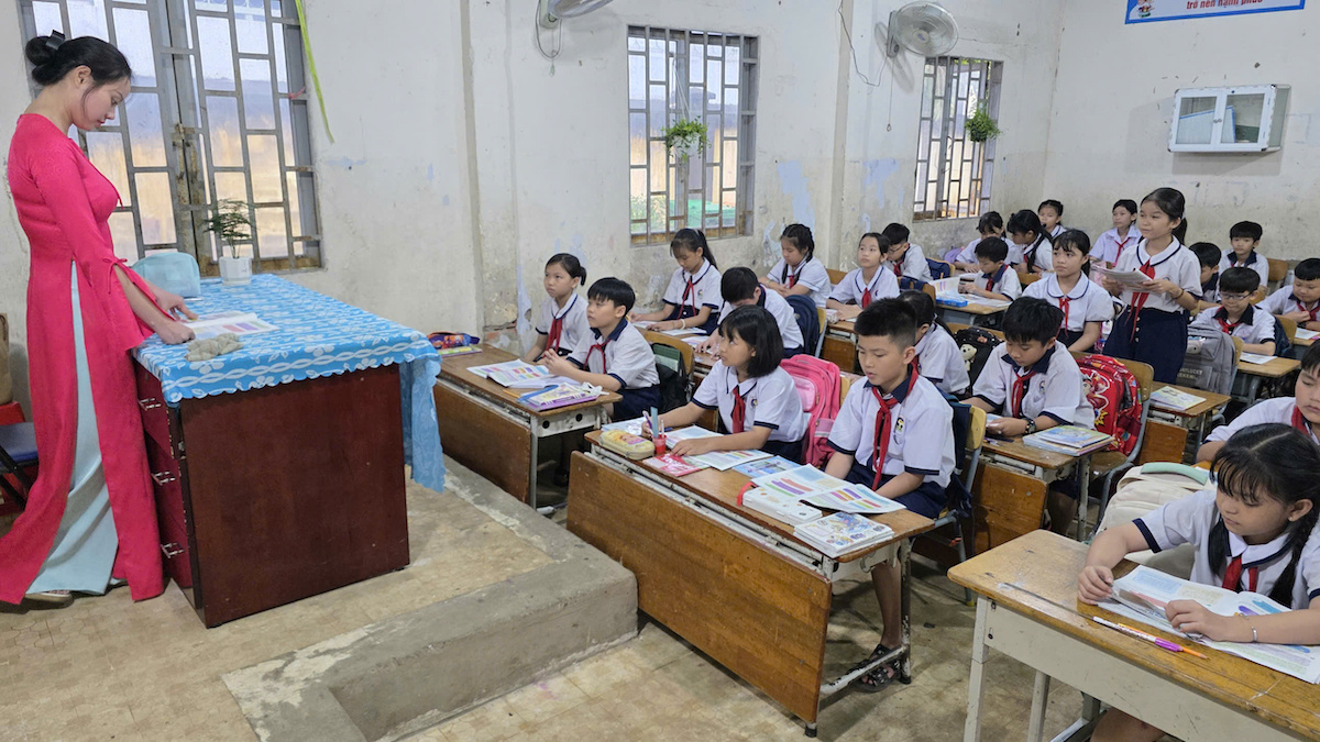 Vinh Tan Primary School has about 2,100 students. The Ministry of Education and Training stipulates a class size of 35 students, but due to overcrowding, classes have 45 to 50 students.