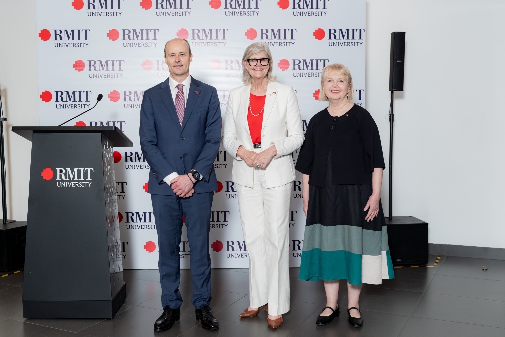 RMIT University Vietnam President Professor Scott Thompson-Whiteside, Australian Governor-General Sam Mostyn AC, and RMIT University Chancellor Peggy O’Neal AO (from left to right). Photo: RMIT