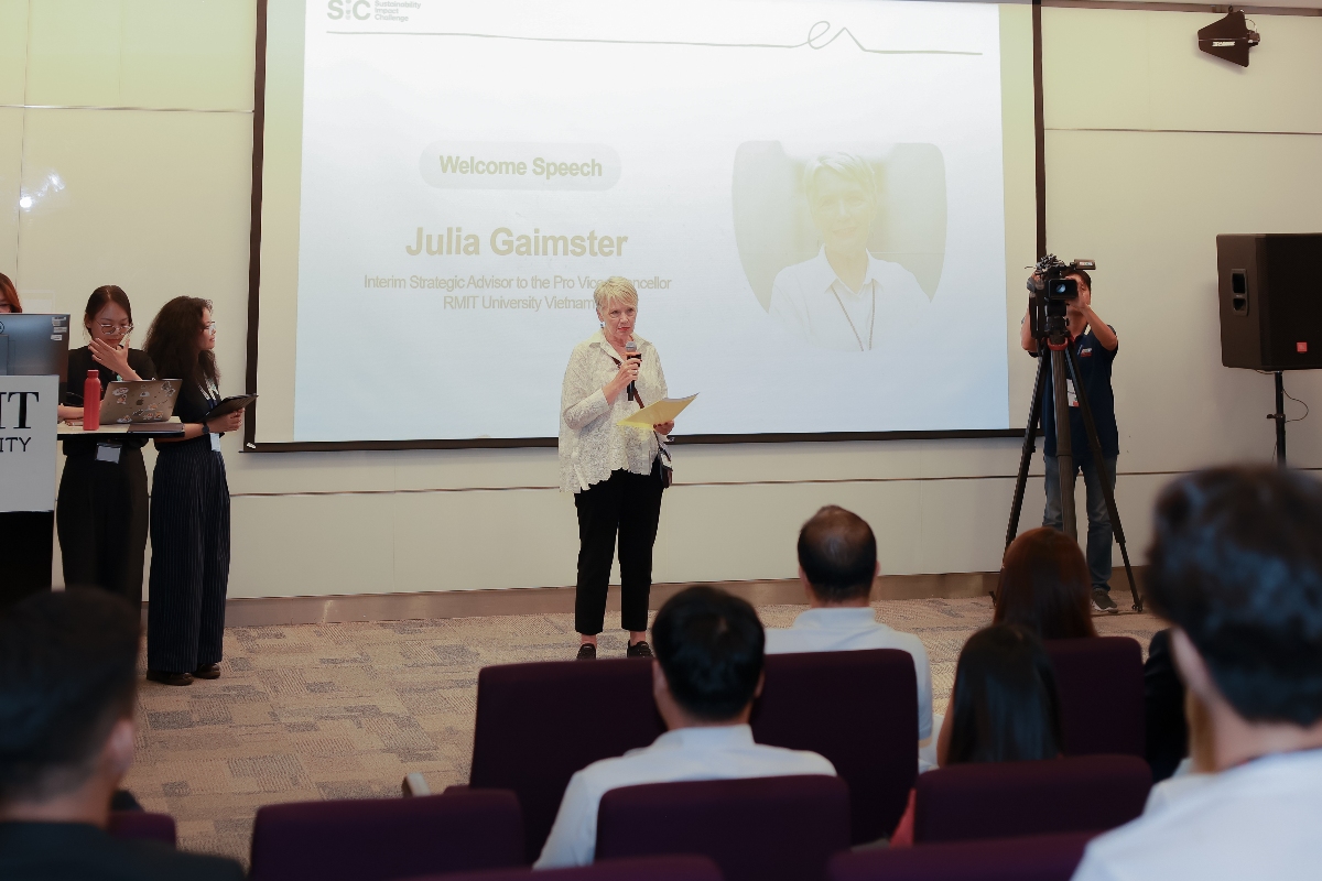 Professor Julia Gaimster, strategic advisor to the president of RMIT University Vietnam, speaks at the 2025 Sustainability Impact Challenge finale. Photo: RMIT |