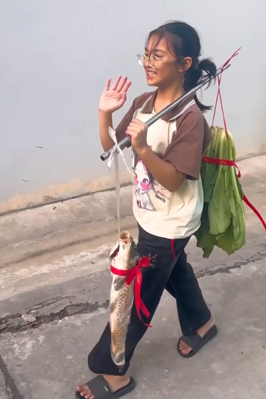 The video captures five students entering the classroom one by one, each carrying two gifts for their teacher. These unique offerings included fresh chickens, fish, pork belly, ribs, mustard greens, potatoes, pumpkin, and green bananas. The chickens and fish were even adorned with festive red bows. Upon receiving these special gifts, the teacher was visibly moved, laughing while her face flushed with shyness.