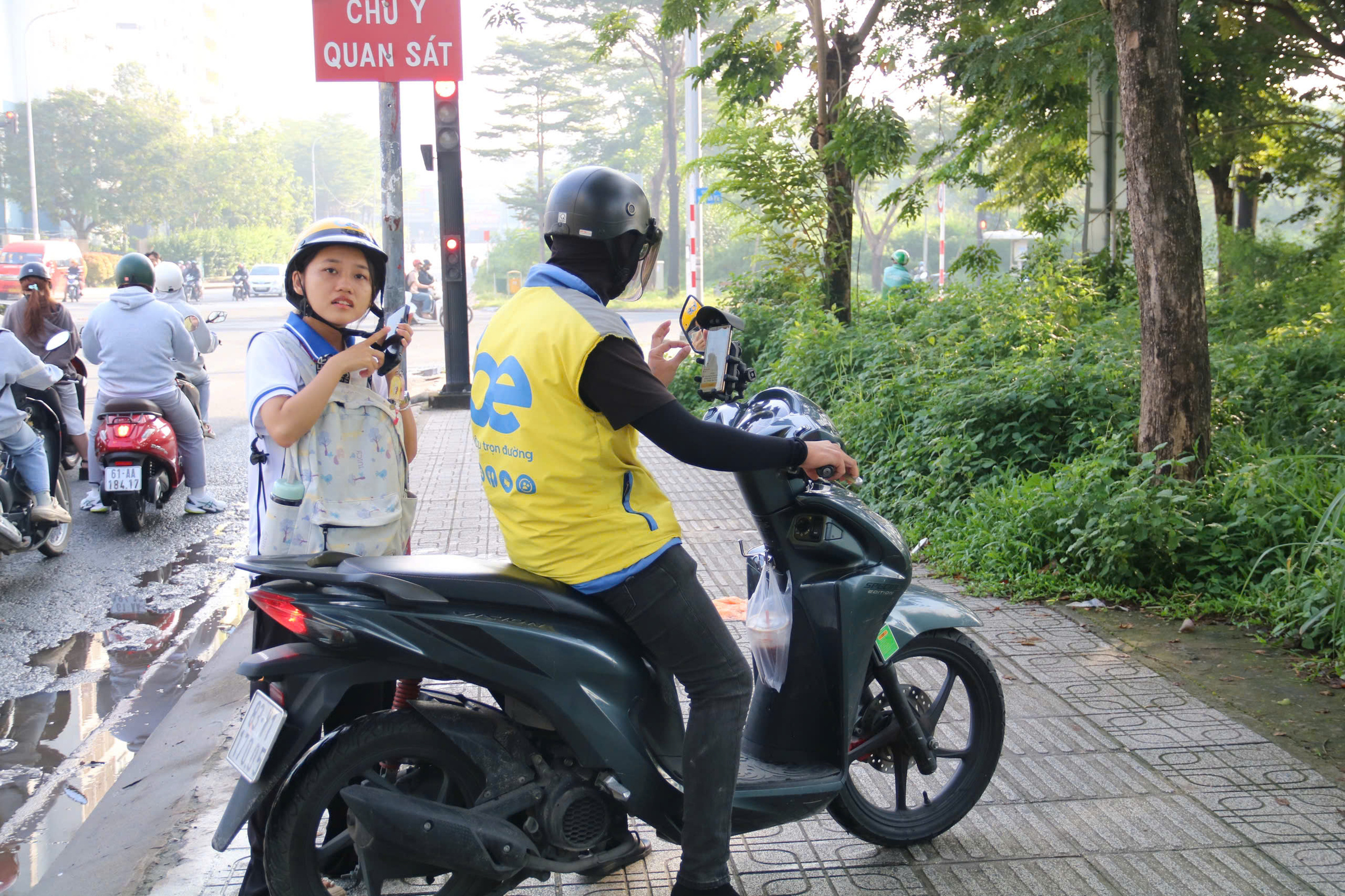 Having waited too long for a bus, students at the Zone B dormitory take ride-hailing services to university on 10/9. Photo: Nhu Ngoc |