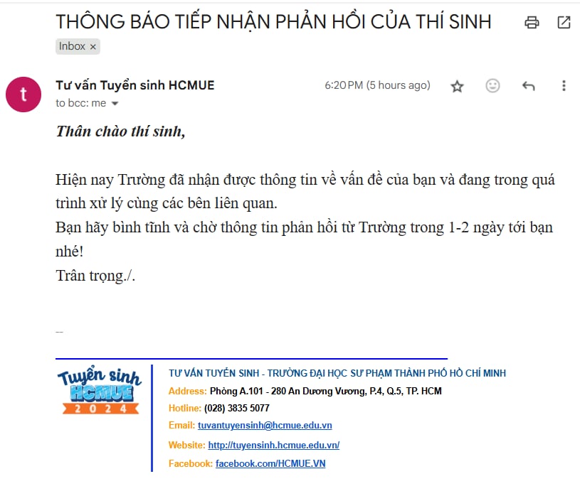 HCMUE's email response to a student's inquiry. Photo: Provided by the student