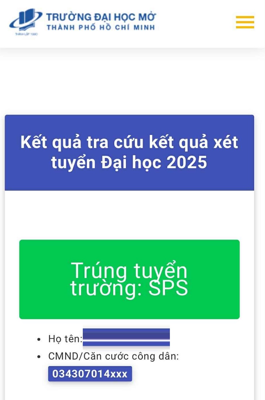 Ho Chi Minh City Open University's website on 25/8 showed Thanh Van as admitted to HCMUE (school code SPS). Photo: Provided by the student