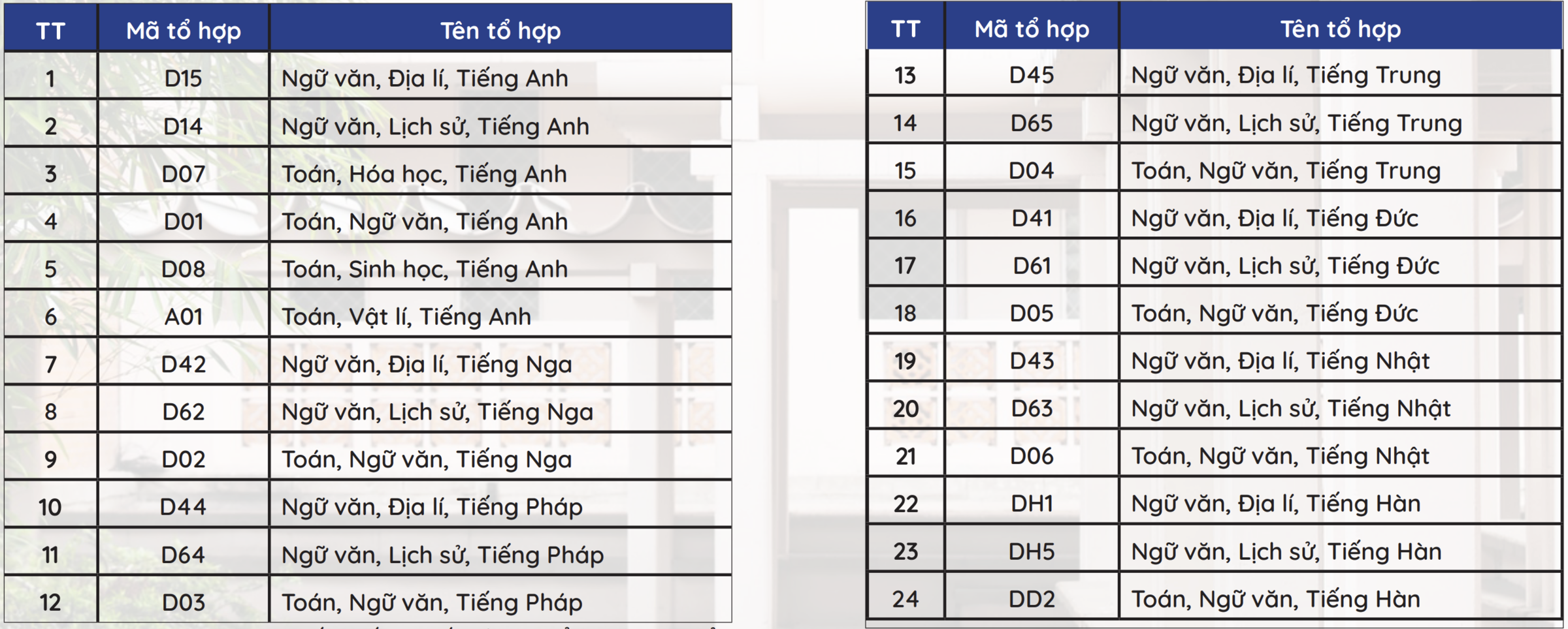 The 24 remaining combinations are for blocks featuring Physics, Chemistry, Biology, combined with Math and one foreign language (Chinese, Korean, Japanese, German). The foreign language subject score will be multiplied by two in all admission combinations, then converted to a 30-point scale.
