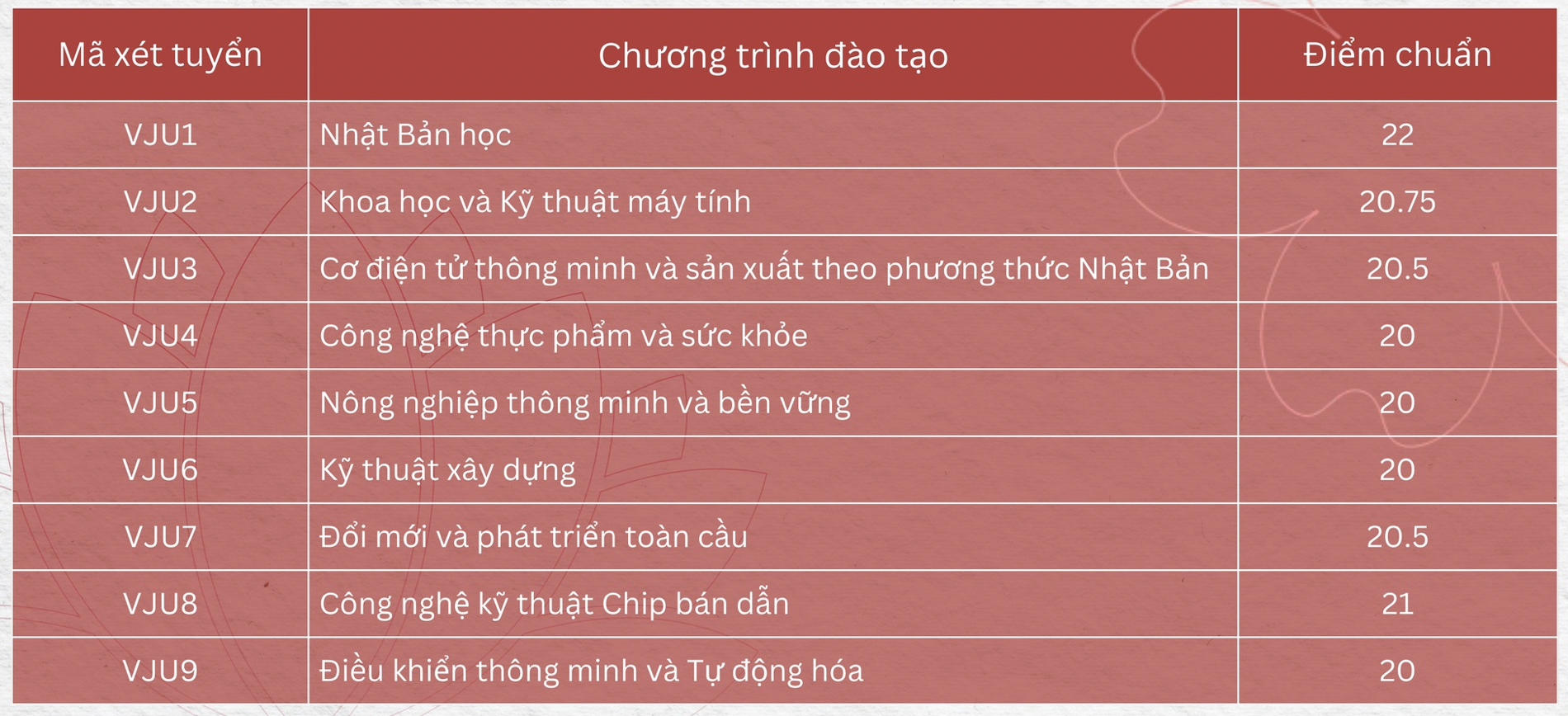 Admission methods include: direct admission, based on the results of the competency assessment exam organized by Vietnam National University, Hanoi; consideration of high school graduation exam scores; combination of graduation exam scores with foreign language certificates; and evaluation of SAT scores and applicant profiles (assessment and interview). For high school graduation exam scores, the university uses 30 combinations.