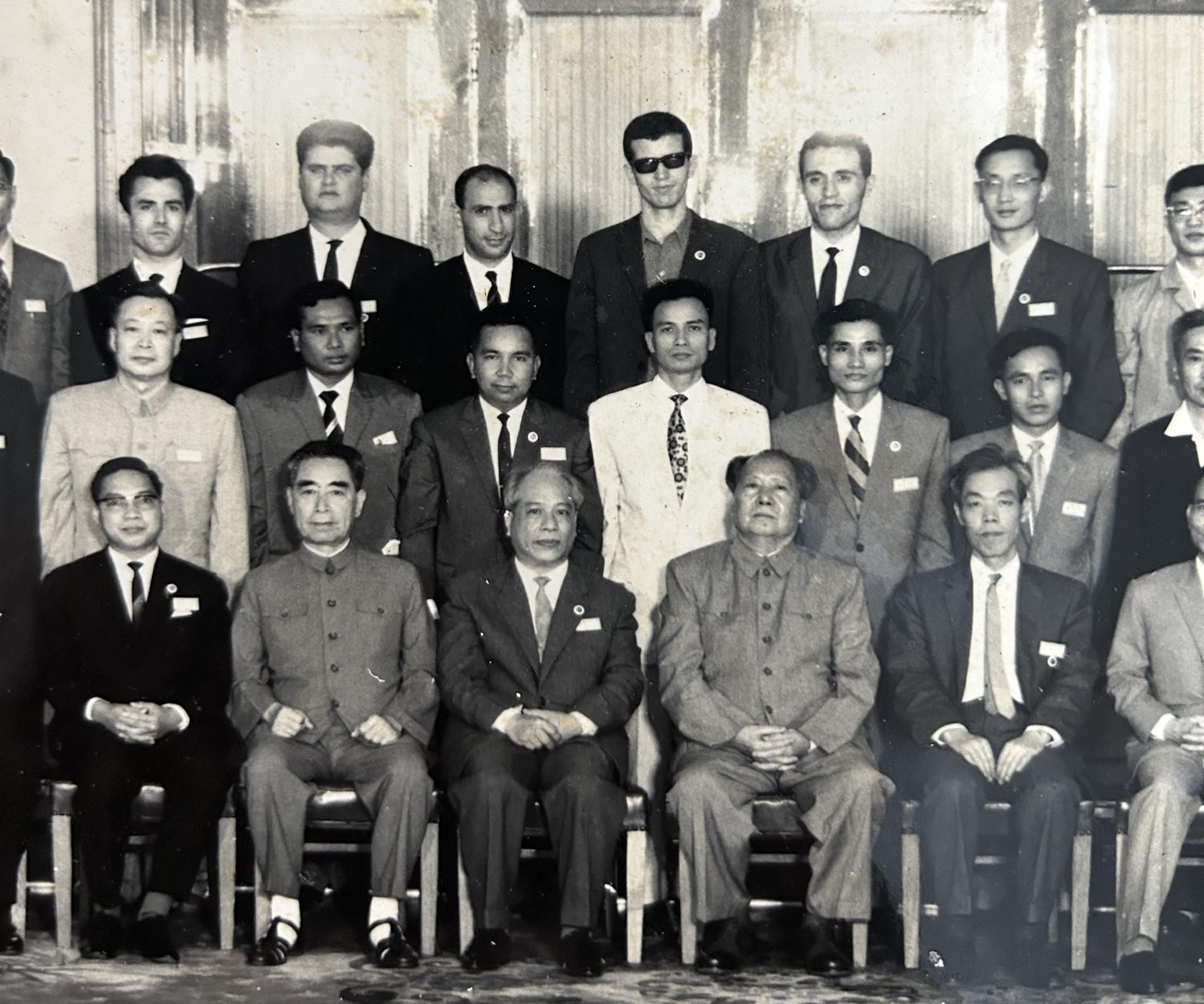 Professor Kontum in a commemorative photo from the International Physics Conference in China in 1966, seated next to Chinese leaders Mao Zedong and Zhou Enlai.