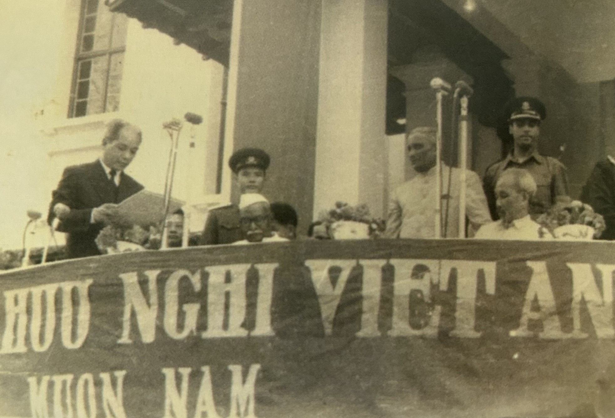 Professor Nguy Nhu Kontum speaking at the reception hosted by President Ho Chi Minh for the Indian President's visit to Hanoi National University.