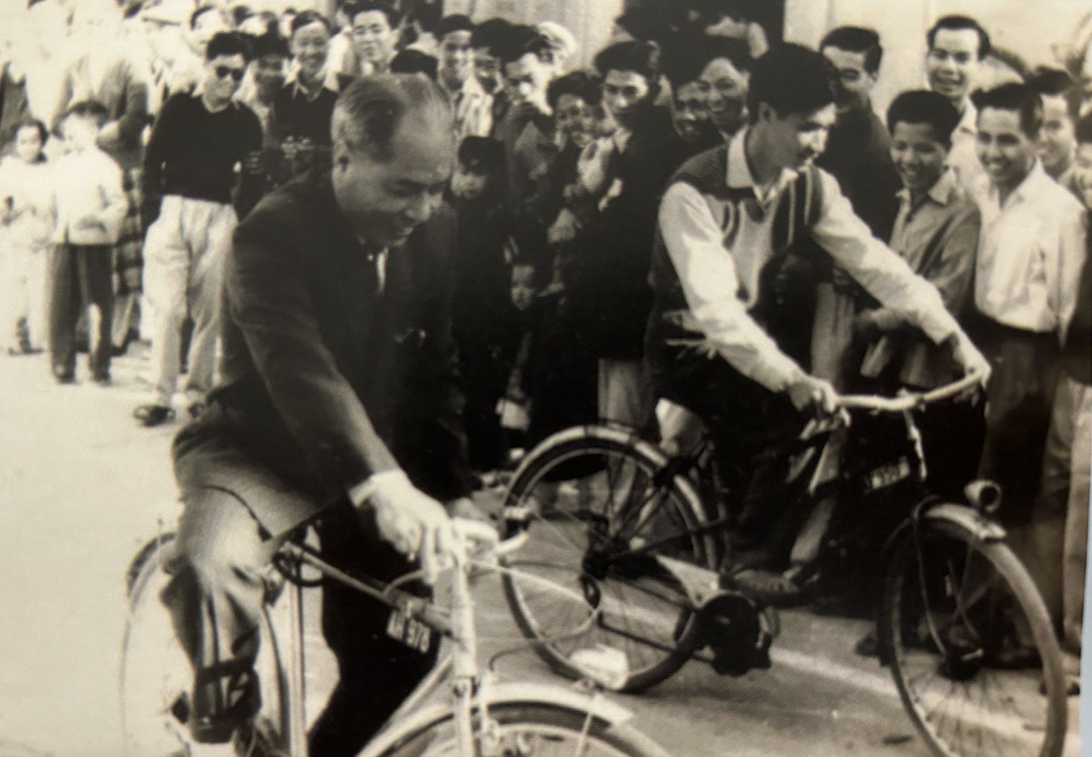 Professor Nguy Nhu Kontum participating in the "Slow Bicycle Ride" contest with students. Photo: Family archives