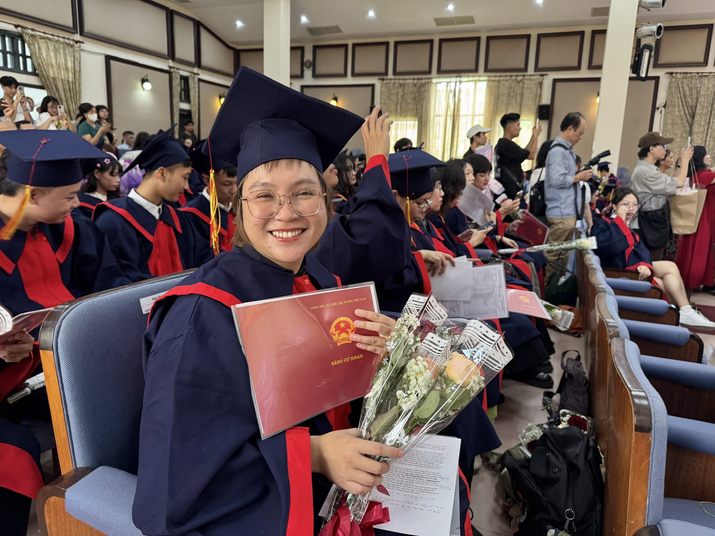 Thanks to five years of consistent effort, Hoa was recognized by the university as the top student of this year's graduating class. On the day she was honored at Van Mieu - Quoc Tu Giam, she was overcome with emotion.
