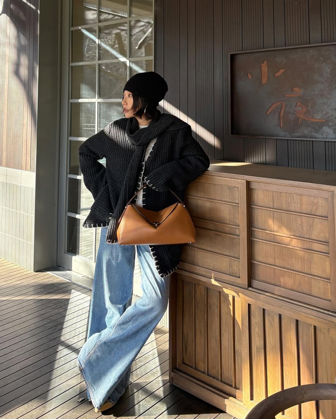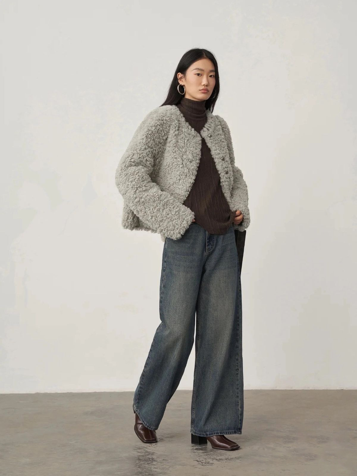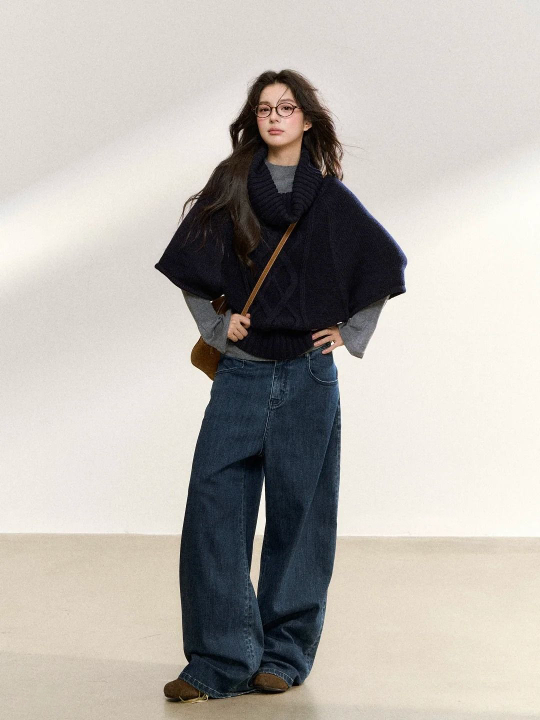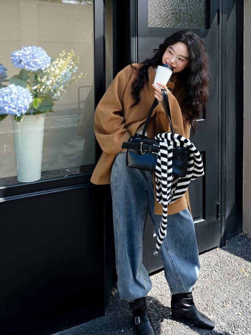 To stay warm while expressing individual style, consider a turtleneck sweater paired with wide-leg jeans, tucked into boots, and completed with a camel or brown funnel-neck wool coat. This combination offers a free-spirited, comfortable feel. |