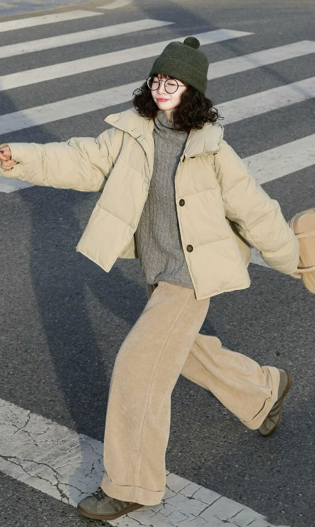When temperatures drop significantly, a down puffer jacket becomes essential. A key to wearing a puffer jacket elegantly and youthfully is to select bright colors such as white, cream, pink, or pastel blue. You can coordinate these with velvet pants, shoes, handbags, and knit hats for a cohesive and vibrant look.